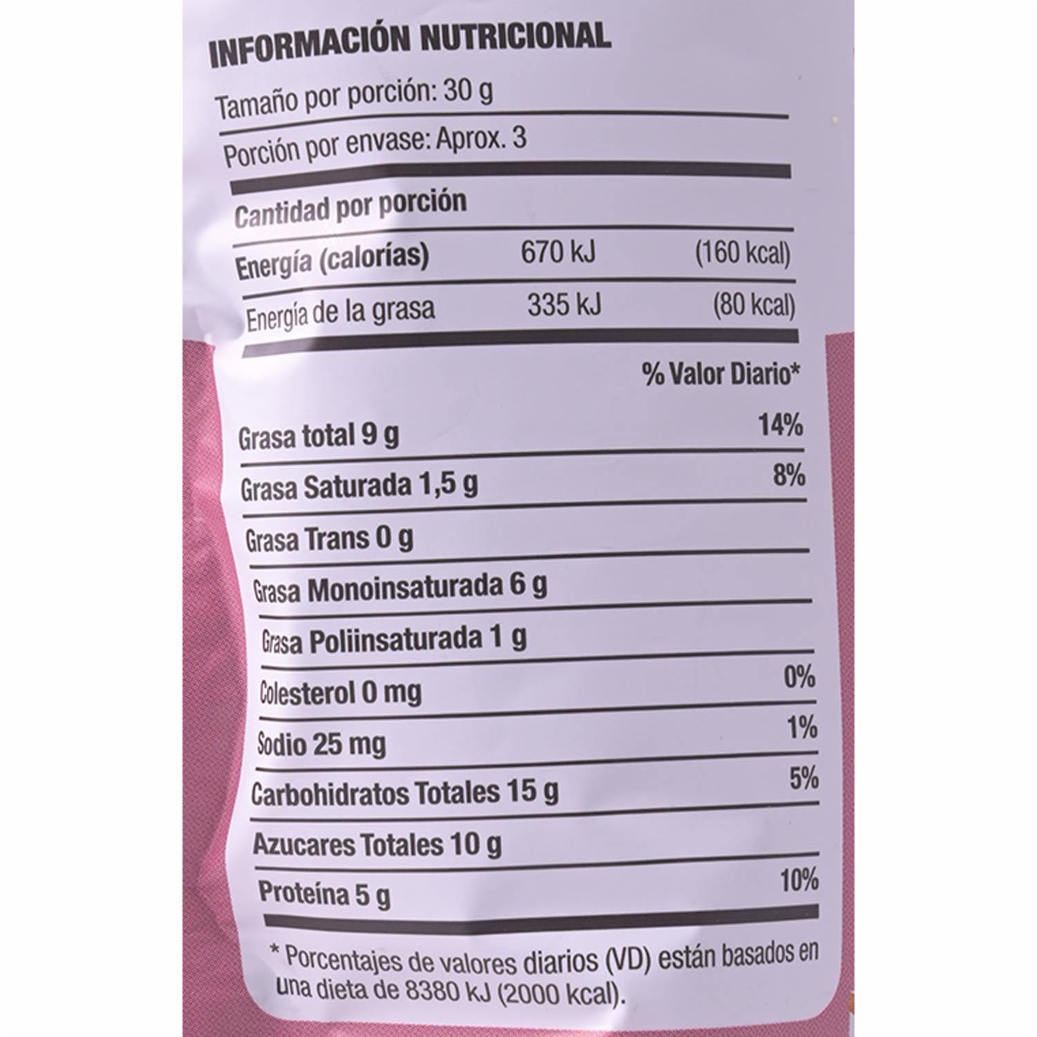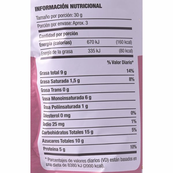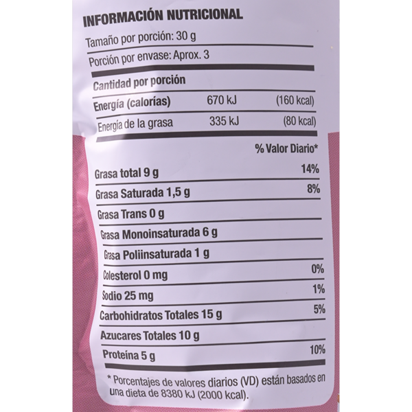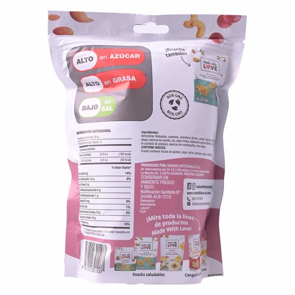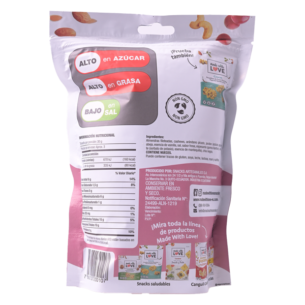 Bocaditos horneados de frutos secos y súper alimentos Láminas de Almendras, Cashews, Arándanos (Cranberries) y Chía, endulzadas con miel de abeja y horneadas Bocaditos crujientes, dulzones y deliciosos. Perfectos como snacks de medio día o media tarde, para compartir con amigos, para comerlos en el desayuno con leche o yogurt, deliciosos sobre ensaladas Llenos de nutrientes como fibra, magnesio, calcio, potasio, antioxidantes y proteínas. No contiene gluten Un snack delicioso y nutritivo