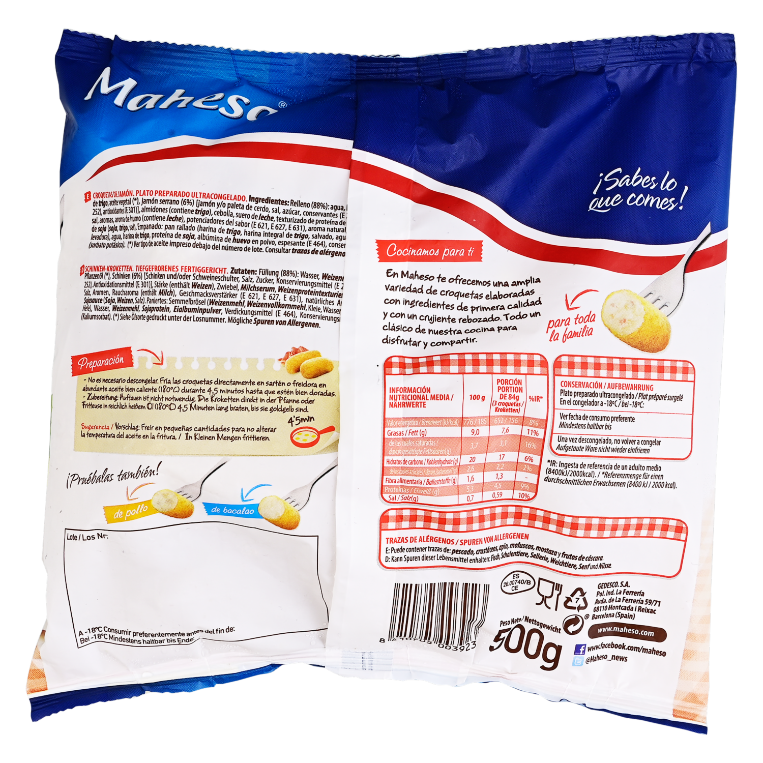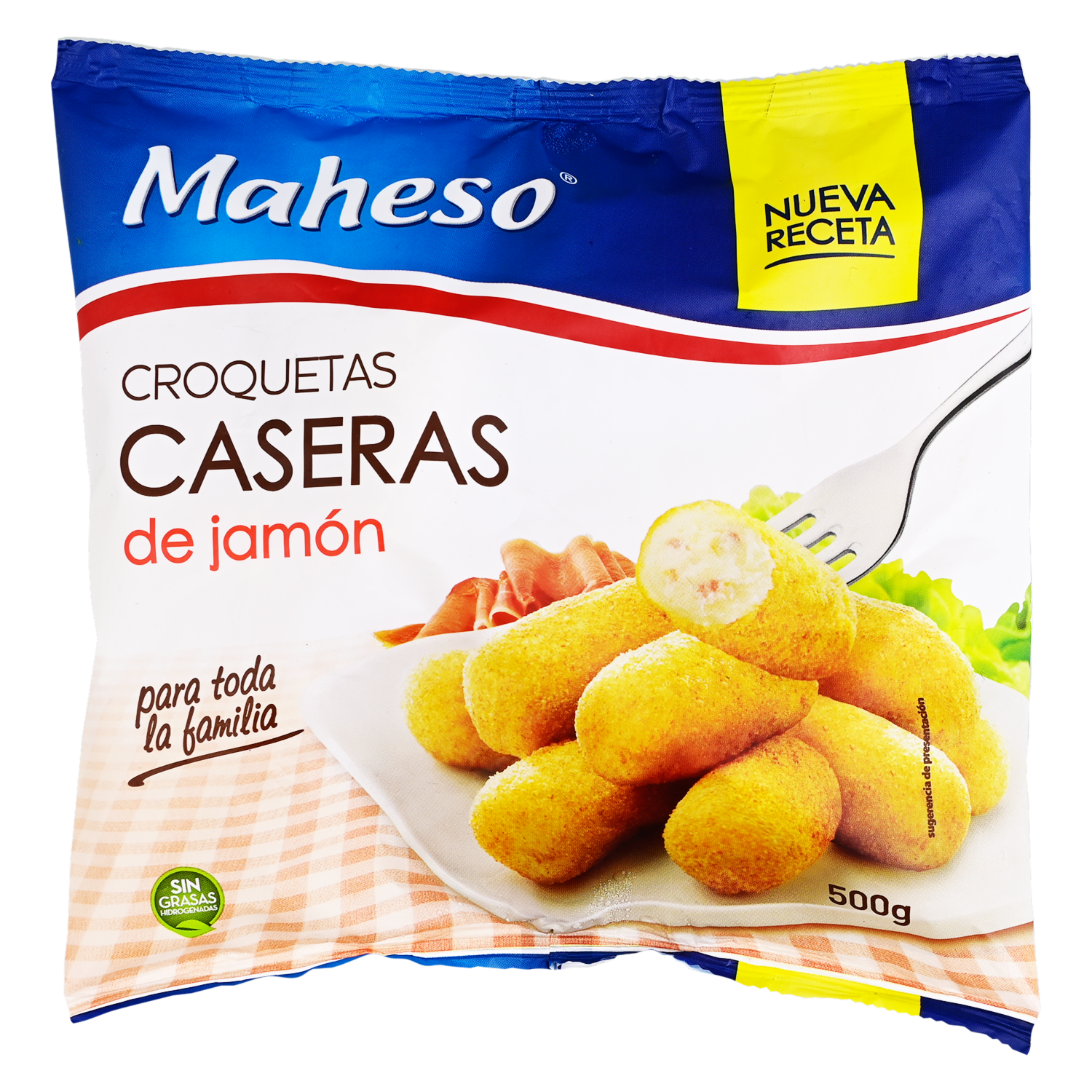 - Las Croquetas Caseras de Jamón MAHESO en presentación de 500 g son una deliciosa opción para disfrutar de estas croquetas tradicionales con el irresistible sabor del jamón