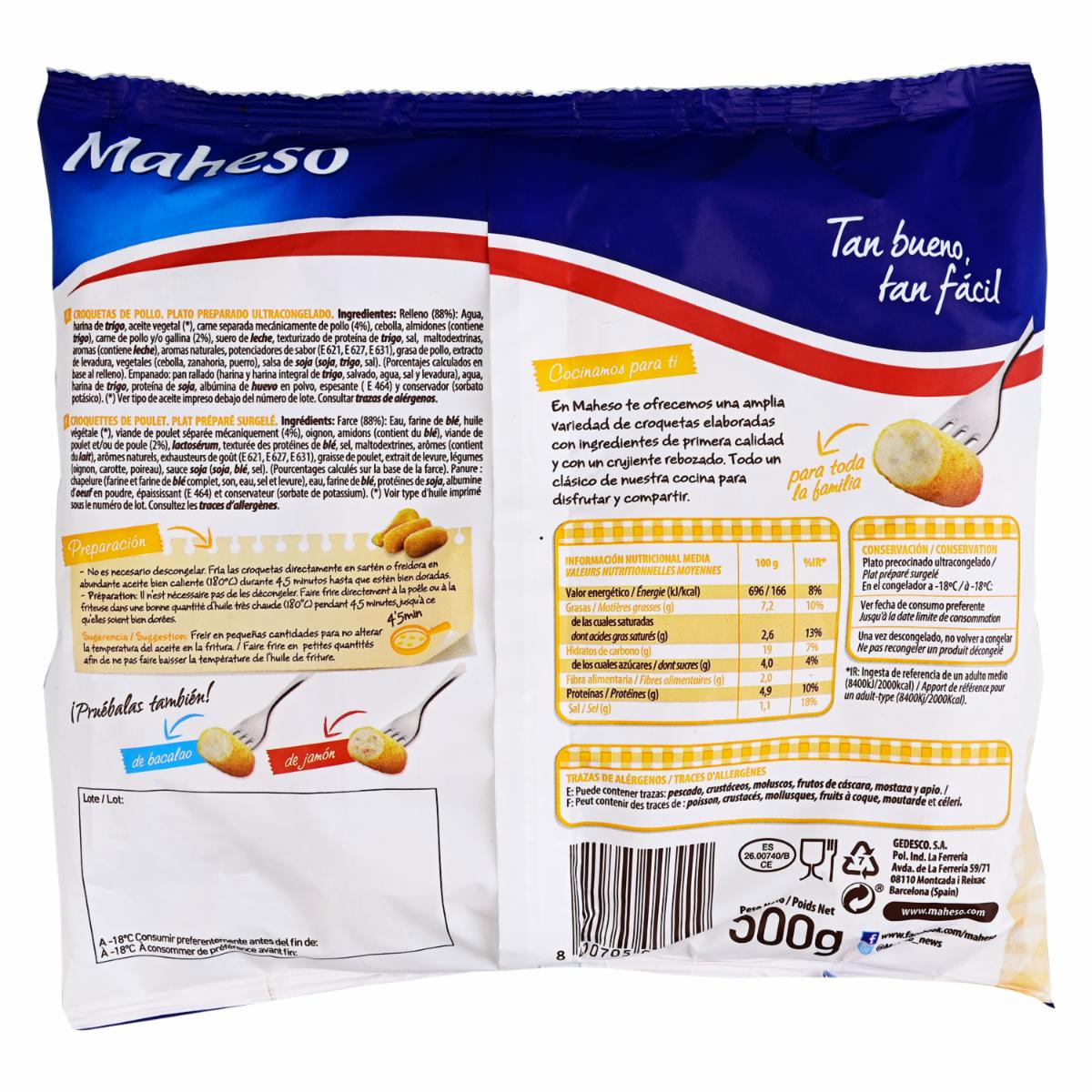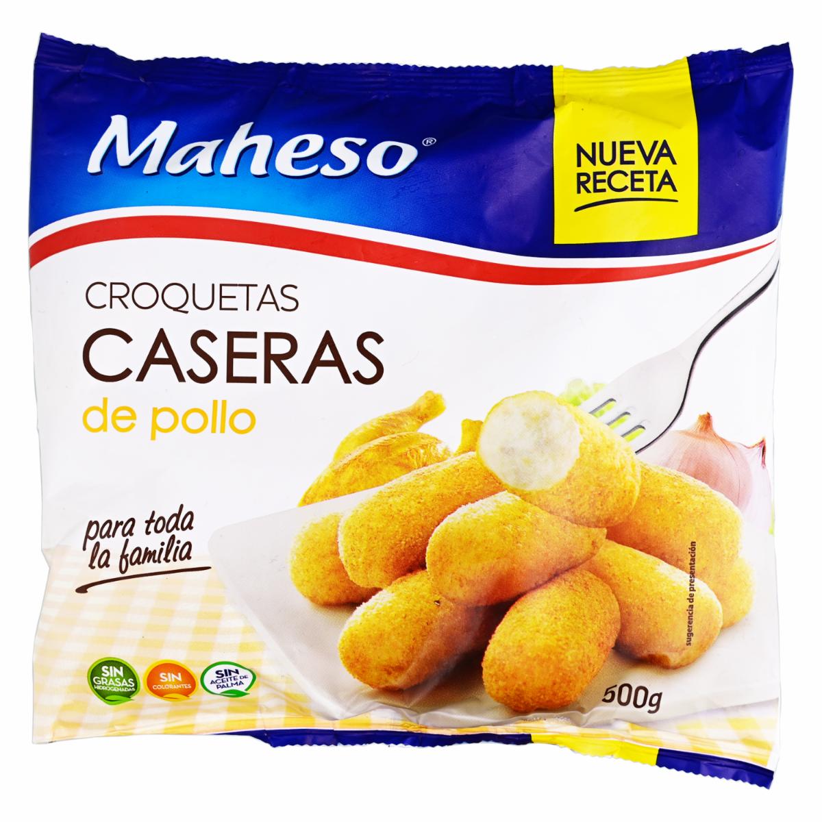- Las Croquetas Caseras de Pollo MAHESO en presentación de 500 g son una opción deliciosa y conveniente para disfrutar de estas croquetas tradicionales en la comodidad de tu hogar