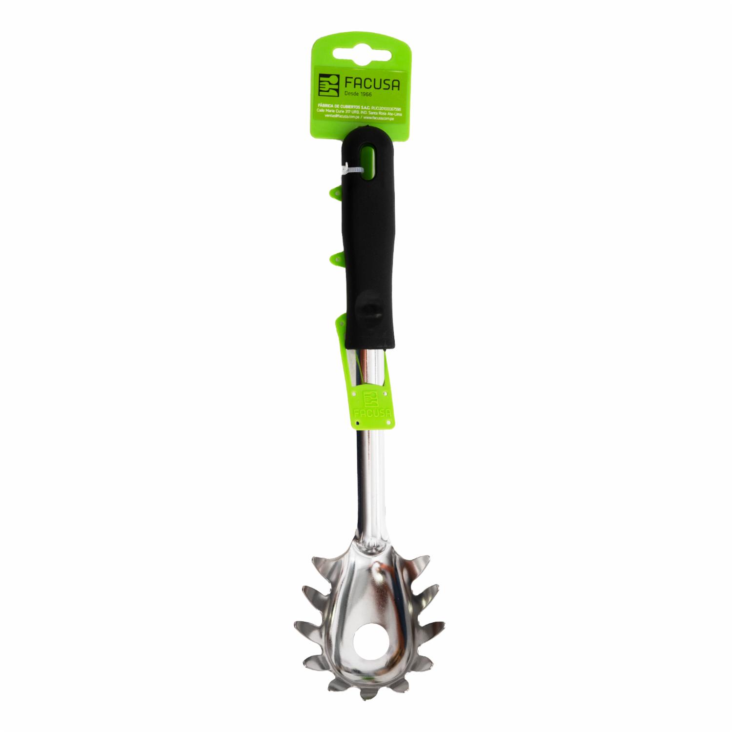 - La Cuchara Spaghetti con Mango de Plástico en Color Negro de FACUSA es la herramienta perfecta para servir espaguetis con facilidad y precisión. Añade esta cuchara a tu cocina para mejorar tu experiencia al servir este popular plato de pasta