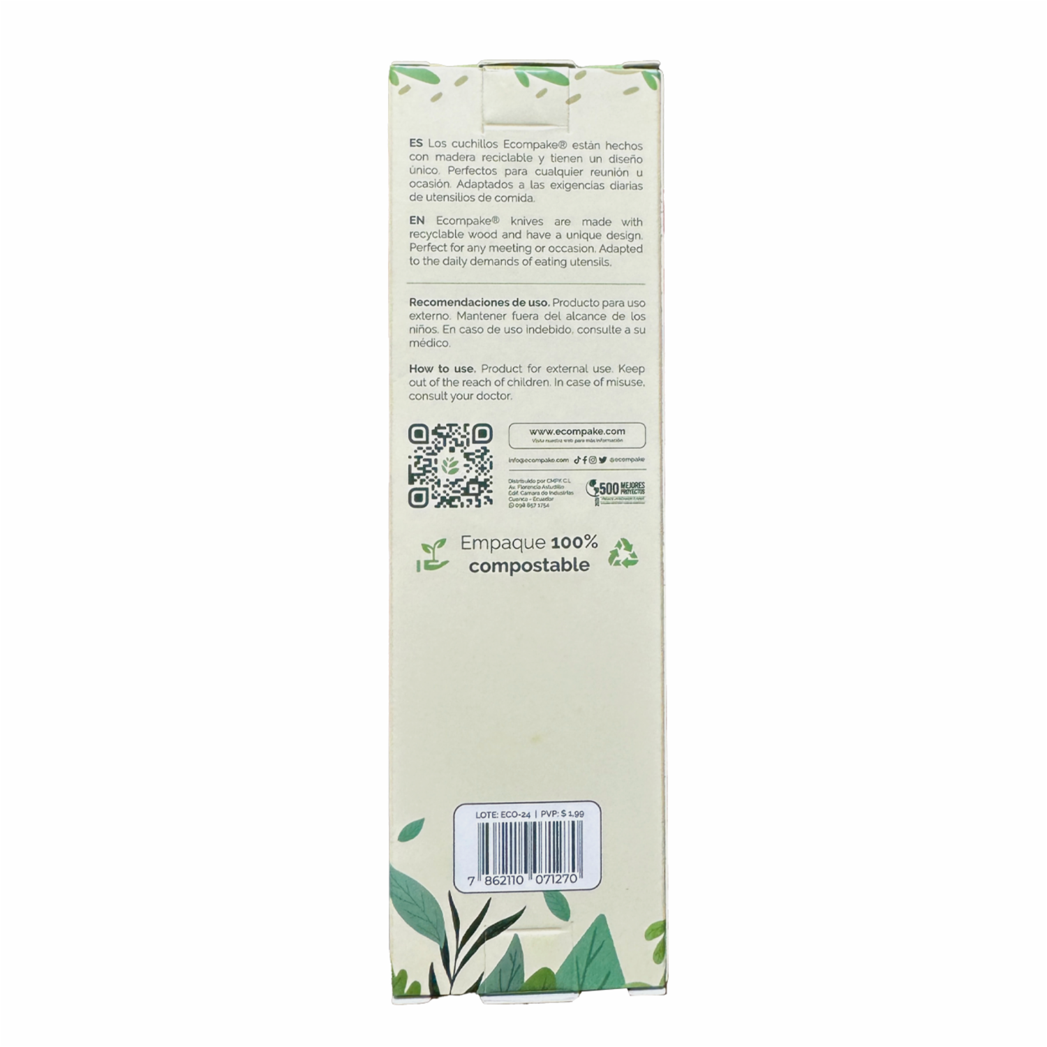 - Cuchillos ECOMPAKE de madera resistentes, 100 % naturales sin procesos artificiales ni aditivos, diseño único, 100 % compostables y 100% biodegradables