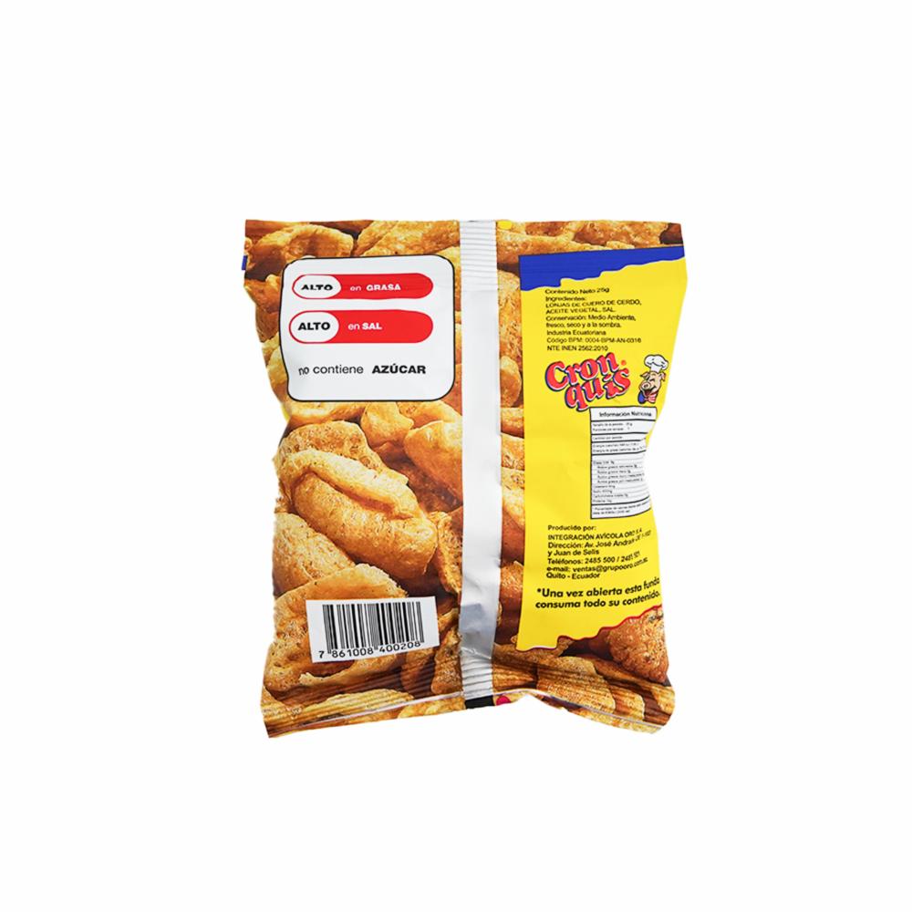 Es un snack de piel de cerdo deshidratada y posteriormente frita y saborizada