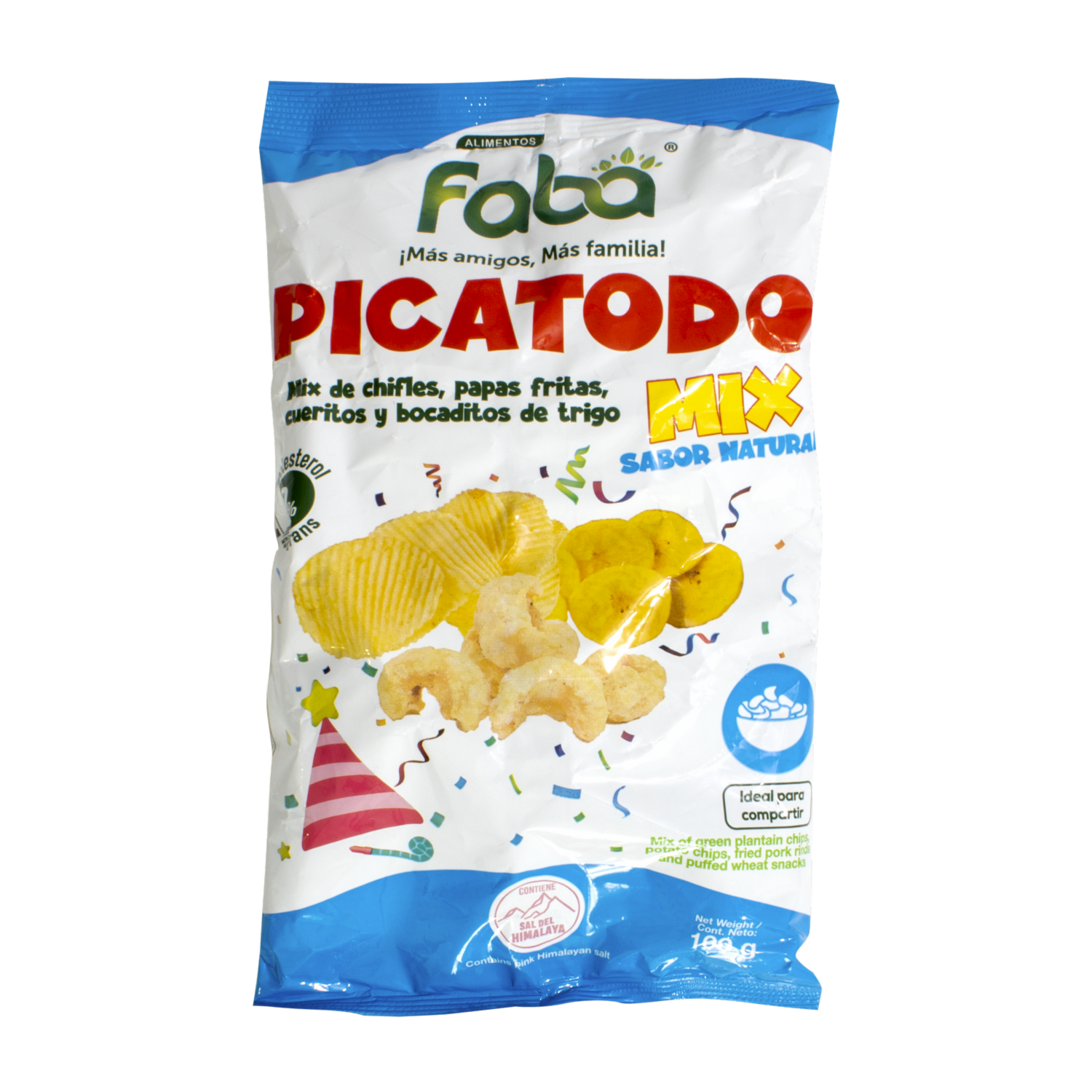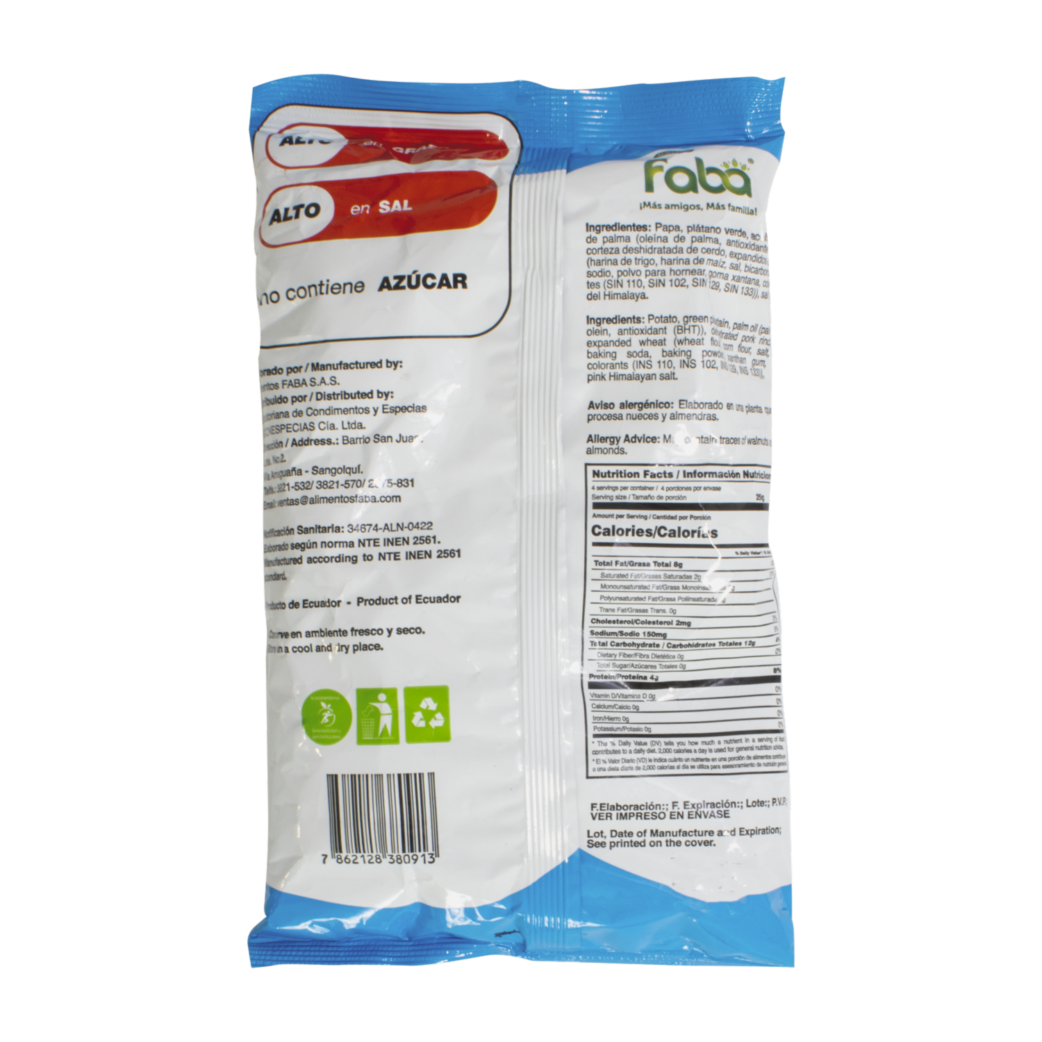 Snack delicioso y crujiente elaborado a partir de piel de cerdo que ha sido cocida y frita hasta obtener una textura crujiente y dorada. FABA es una marca reconocida por su calidad y sabor en el mercado de snacks