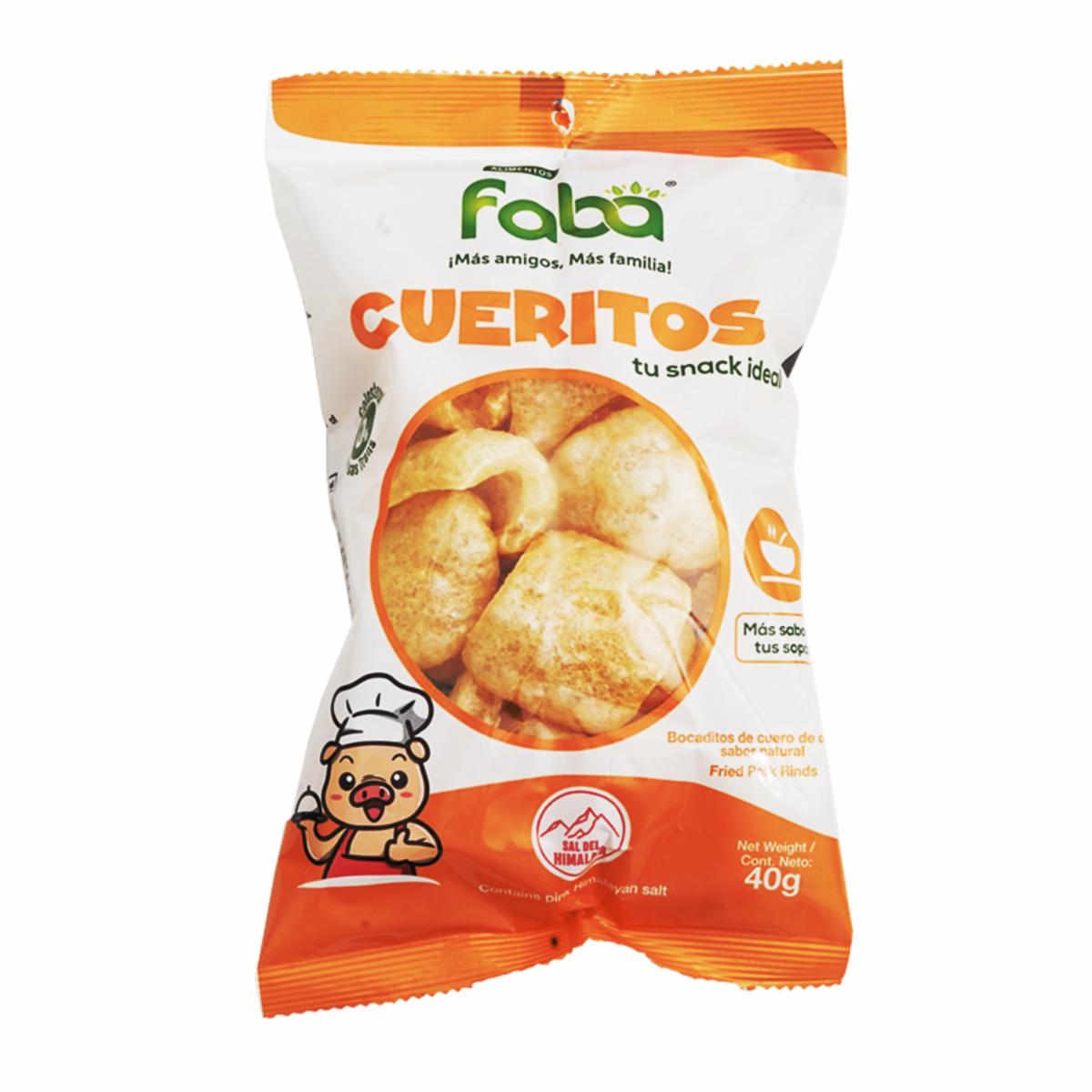 - Los cueritos sabor natural FABA en presentación de 40 g son un snack delicioso y crujiente elaborado a partir de piel de cerdo que ha sido cocida y frita hasta obtener una textura crujiente y dorada. FABA es una marca reconocida por su calidad y sabor en el mercado de snacks