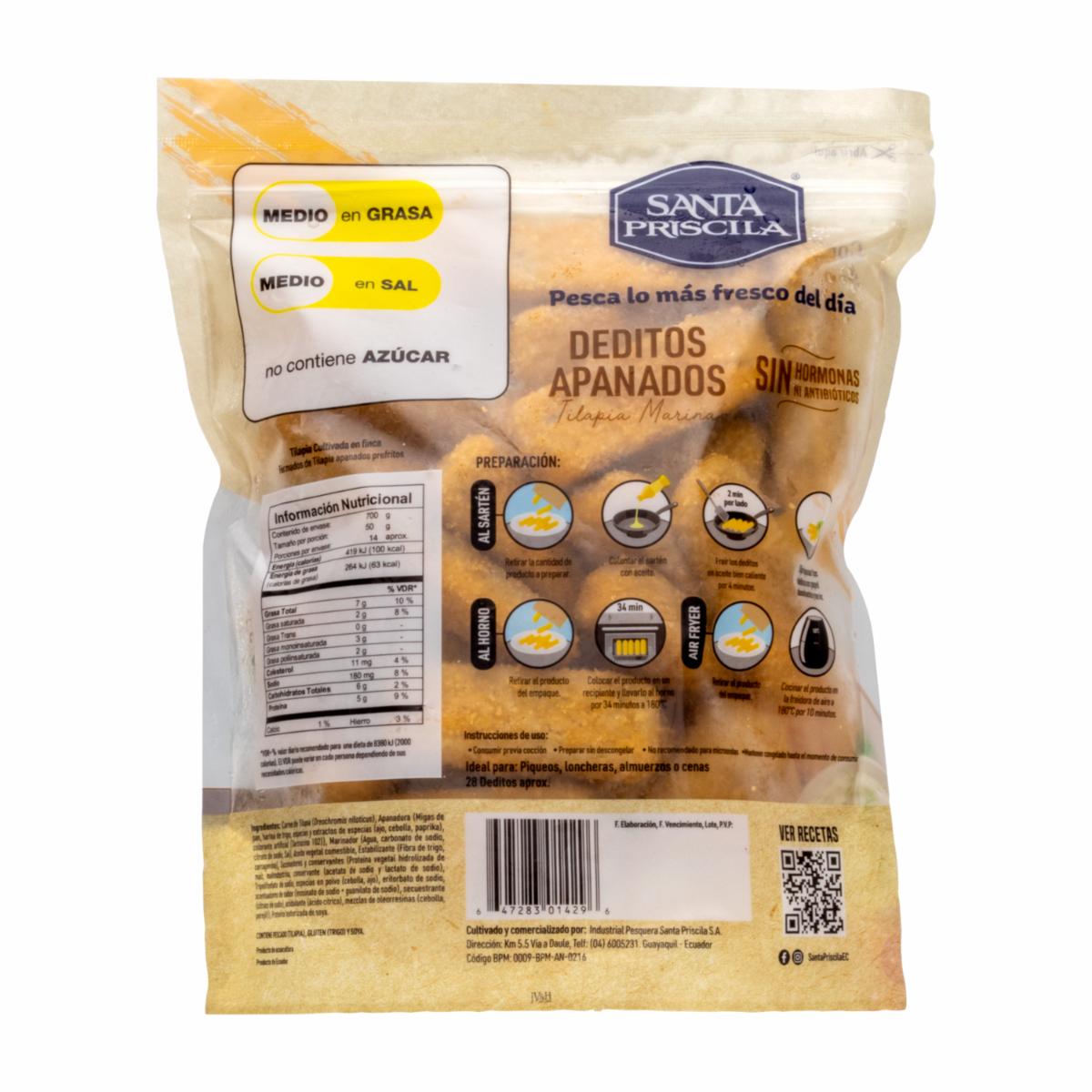 - El suave sabor de la tilapia de Santa Priscila permite que los deditos de tilapia apanados sean perfectos para grandes y pequeños. Lo crujiente de tu cobertura con la suavidad de tu contenido es la combinación ideal