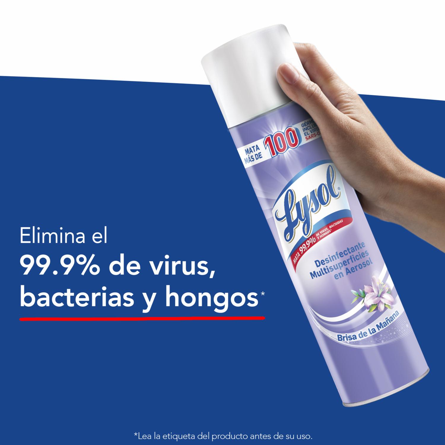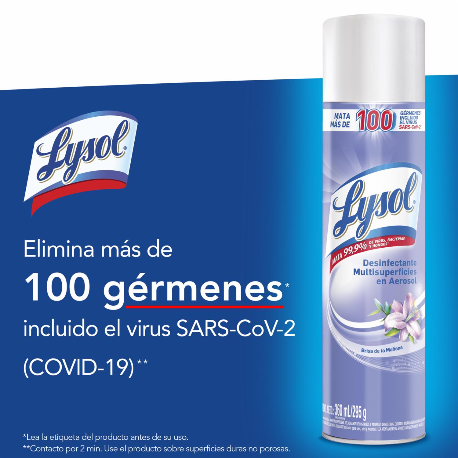 - Lysol Aerosol Desinfectante Brisa De La Mañana Elimina El 99,9% De Virus, Bacterias Y Hongos De Diferentes Superficies. Su Potente Fórmula Es Eficaz Contra Más De 100 Tipos De Gérmenes Causantes De Enfermedades Incluyendo El Virus Sars-cov-2 Causante Del Covid-19. Desinfecta Para Proteger