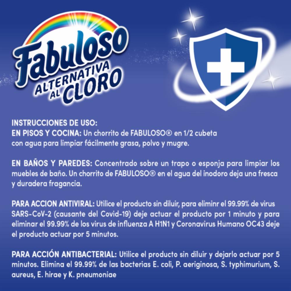 • Mantén tu hogar siempre protegido contra amenazas hacia tu salud y la de tu familia con el Limpia Pisos Fabuloso Alternativa al Cloro Frescura Natural 1 L. Está especialmente diseñado para brindarte una acción antiviral y antibacterial