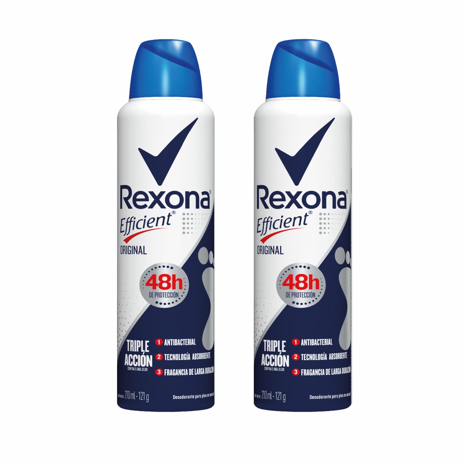 - El Nuevo Desodorante Para Pies Rexona Efficient Original En Aerosol Está Especialmente Formulado Para Detener El Sudor Y El Olor Producido Por Los Pies, Su Nueva Fórmula Que Permite Tener 48 Hs De Protección Y Triple Acción Contra El Mal Olor, Tecnología Absorbente, Fragancia De Larga Duración. Aplicá Los Desodorantes Para Pies Diariamente A Tus Pies Limpios Y Secos Antes De Ponerte Los Calcetines Y Los Zapatos, Tus Pies Van A Permanecer Secos Y Sin Olor Durante Todo El Día