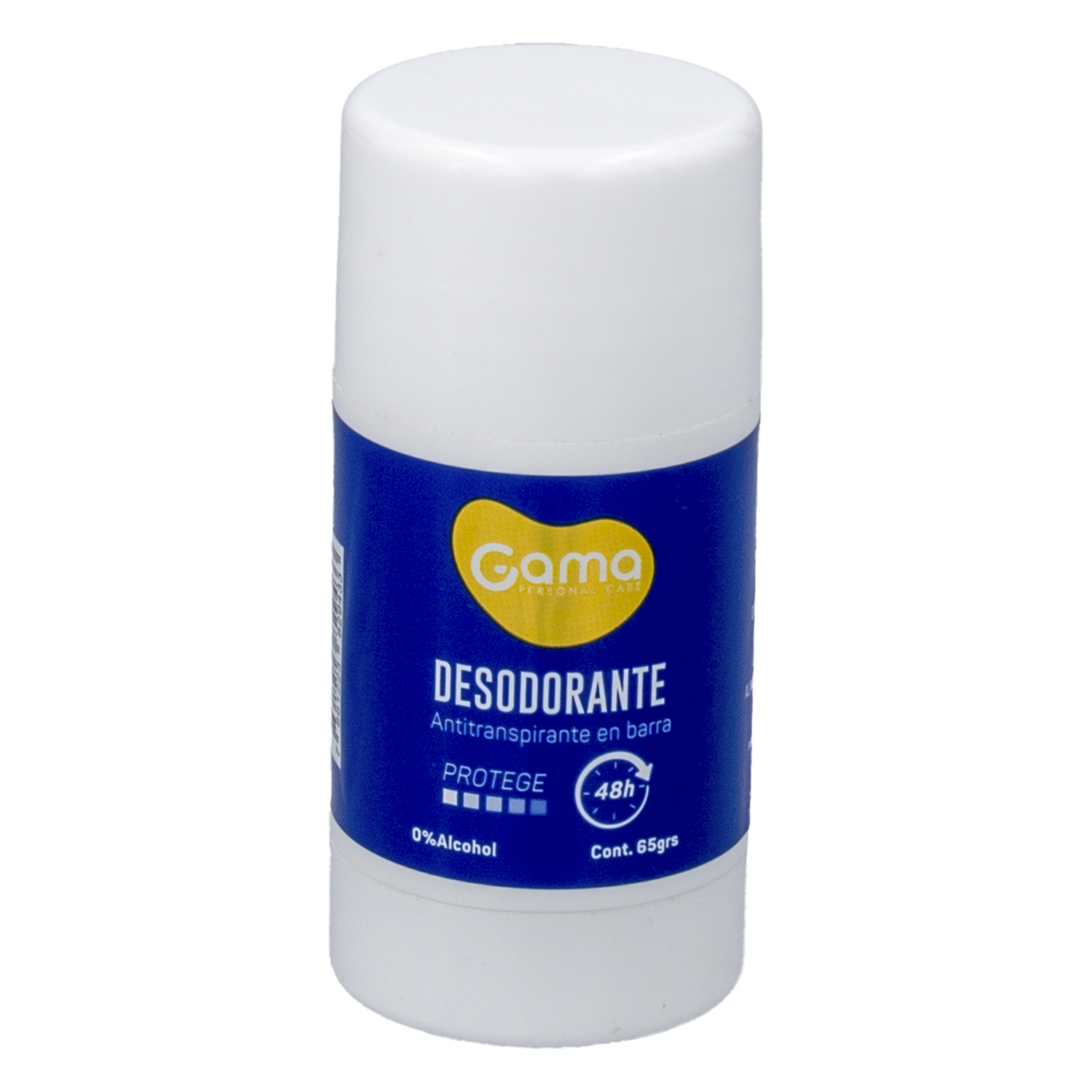 - Comienza cada día con seguridad y frescura gracias a este desodorante antitranspirante en barra de GAMA. Está formulado para brindar protección duradera contra el sudor y el mal olor, especialmente pensado para la piel masculina. Su presentación de 65?g es perfecta para uso diario, y su formato barra permite una aplicación rápida y cómoda