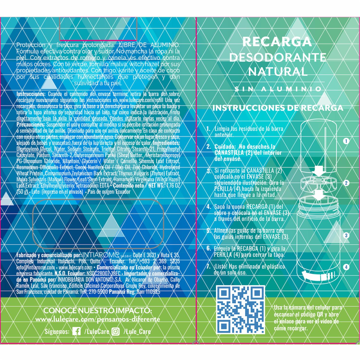 - Recarga para el Desodorante natural Lulë Spört EXTRA PROTECCIÓN fragancia fresca, ideal para gente activa, SIN ALUMINIO, triclosan y parabenos