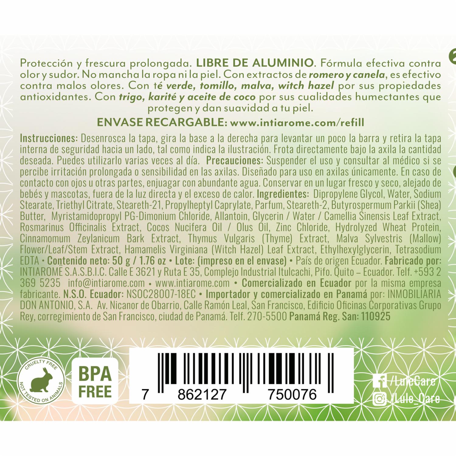 - Desodorante natural Lulë Care REFRESHING VERBENA, fragancia refrescante, cítrica, SIN ALUMINIO, triclosan y parabenos