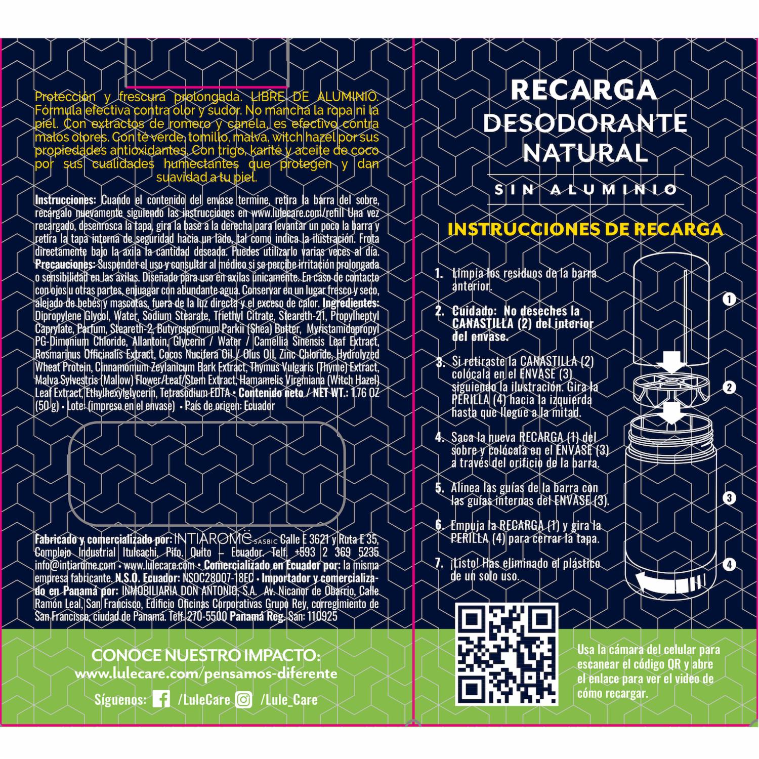 - Recarga para el Desodorante natural Lulë SIMPLY FRESH, fragancia simplemente fresca, SIN ALUMINIO, triclosan y parabenos