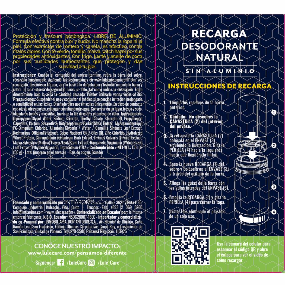 • Recarga para el Desodorante natural Lulë SIMPLY FRESH, fragancia simplemente fresca, SIN ALUMINIO, triclosan y parabenos