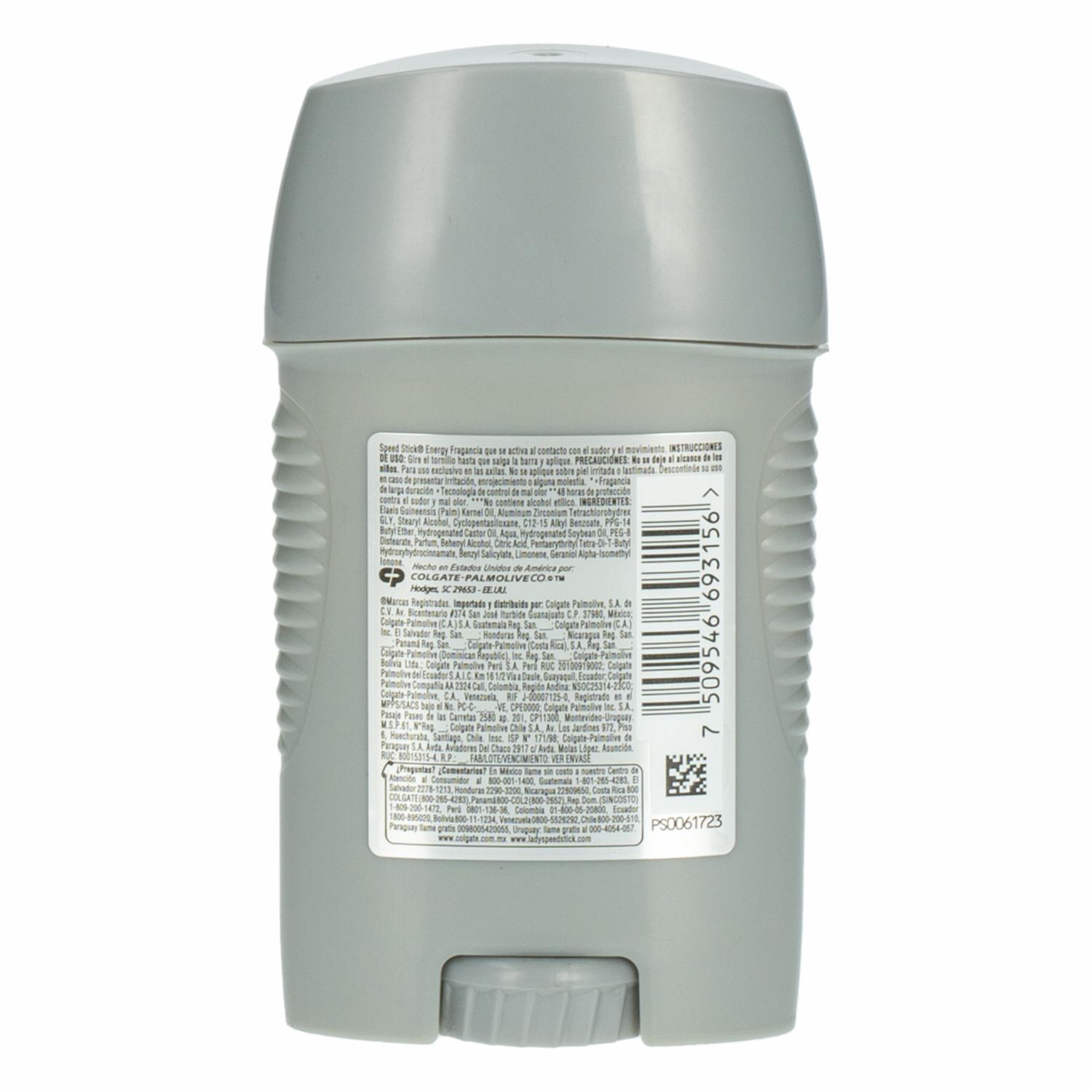 - El Desodorante en Barra para Caballero Energy SPEED STICK 50 g ofrece protección duradera contra el sudor y el mal olor, manteniéndote fresco y seguro todo el día