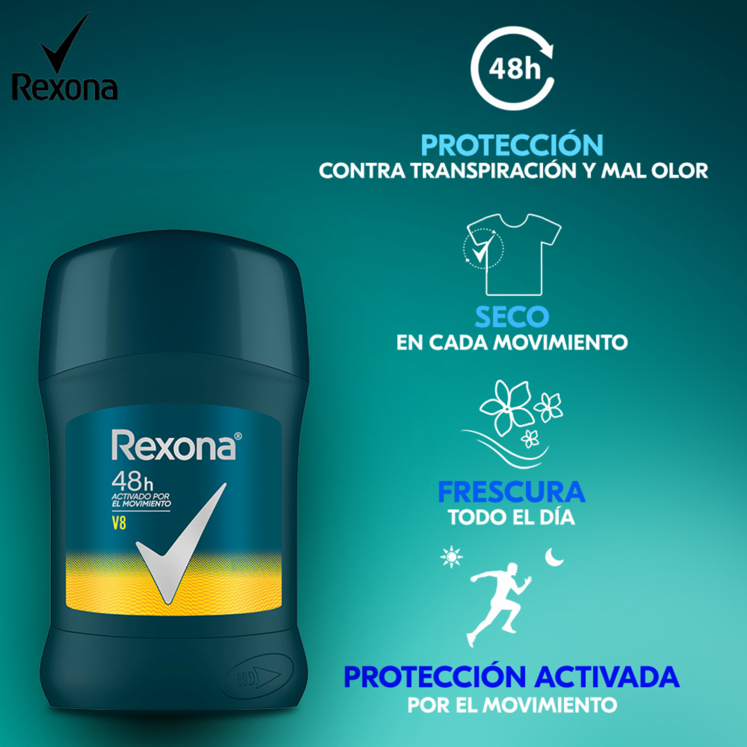 - Experimenta una protección potente y antibacterial con el Desodorante Barra V8 Antibacterial de Rexona en su envase de 50g. Su fórmula avanzada te mantiene fresco y seguro durante todo el día, brindando una protección efectiva contra el mal olor y las bacterias. Ideal para hombres activos, su formato en barra es cómodo de aplicar y su aroma masculino es perfecto para cualquier ocasión. Rexona V8 Antibacterial, la potencia que necesitas para estar protegido en cada momento