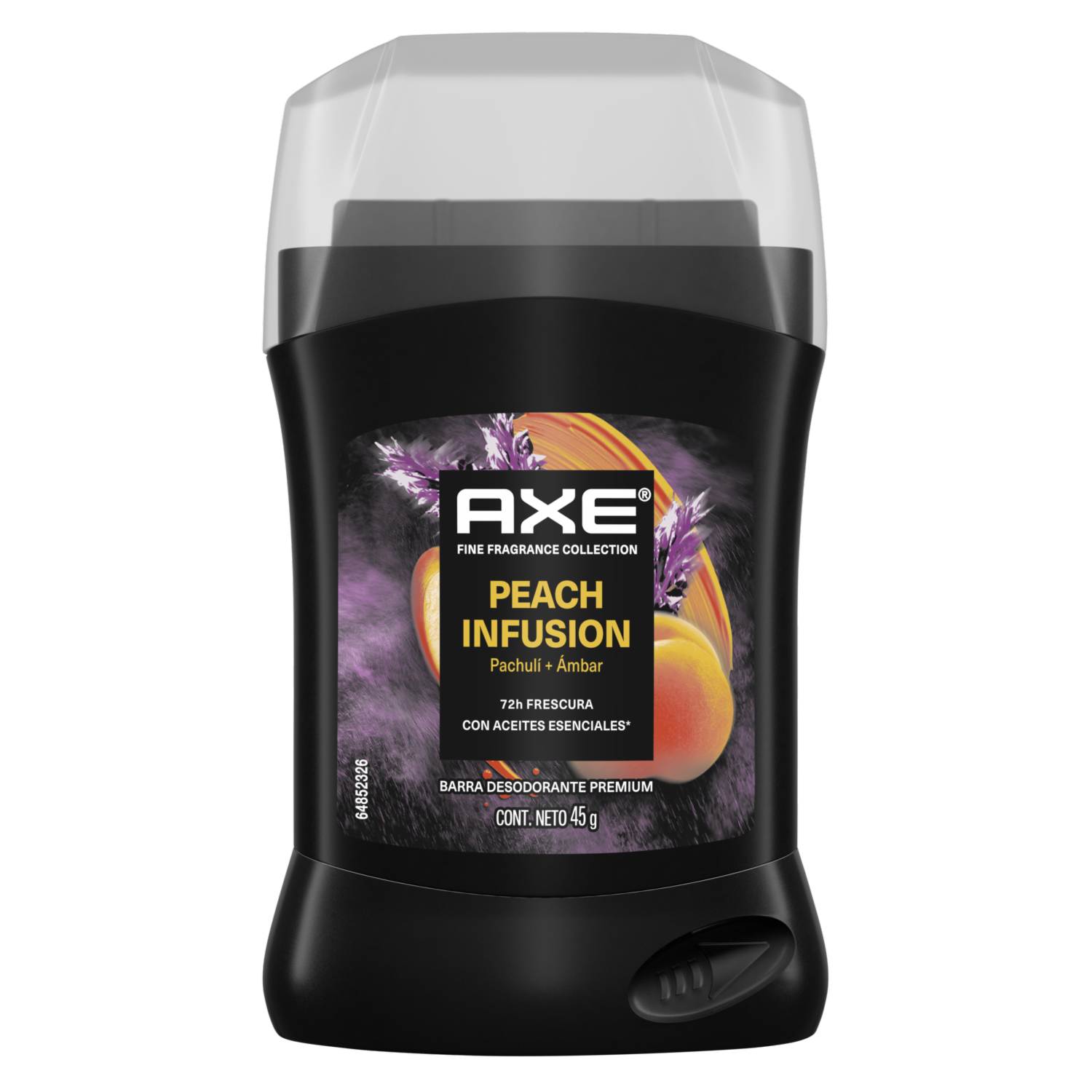 - Desodorante en barra AXE Peach Infusion de 45 g. Aroma sofisticado con esencia de durazno que ofrece frescura prolongada y protección confiable