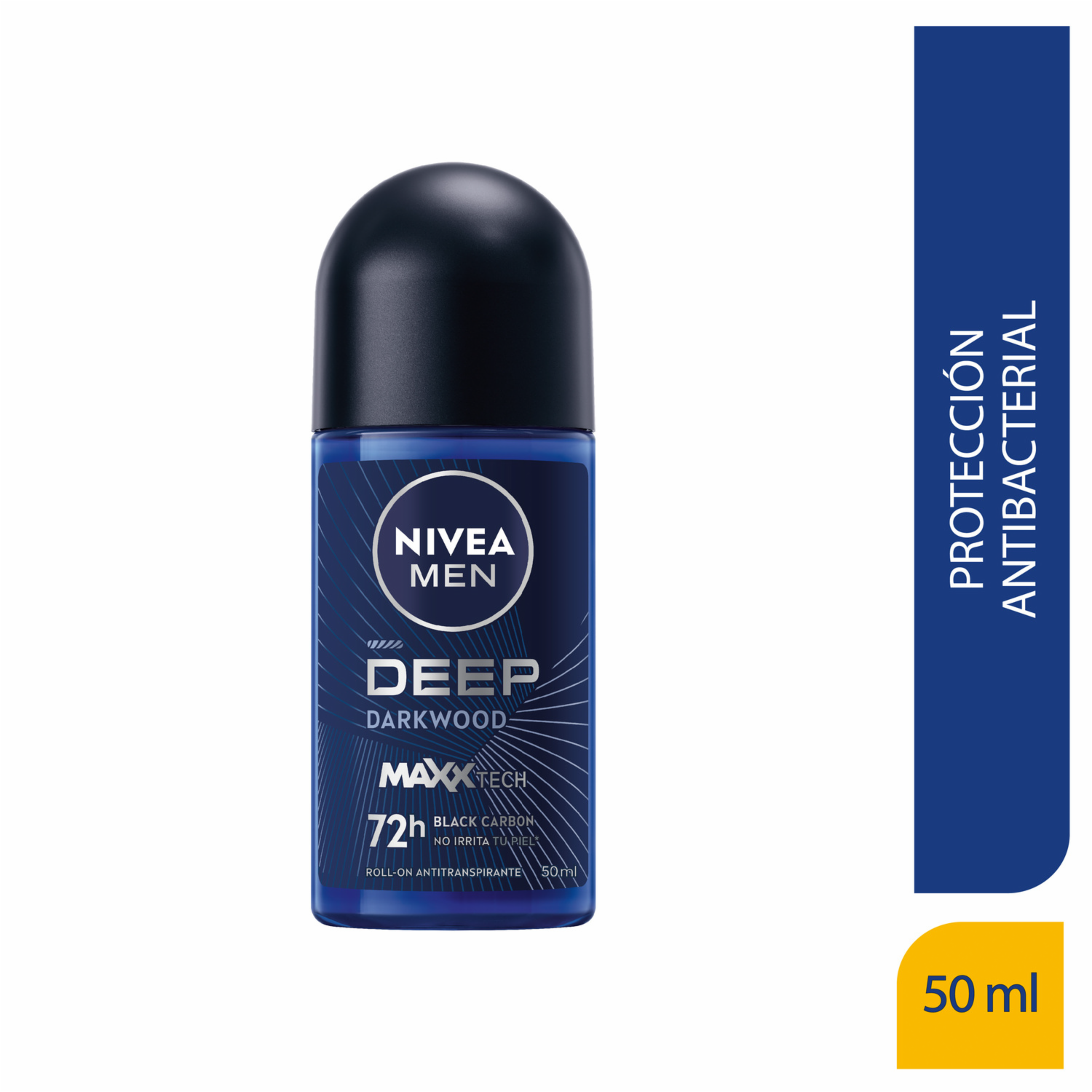 Nivea Deo Roll On Deep Darkwood 50ml, ofrece 72 horas de confiable protección antitranspirante. MAXXTECH fórmula con black carbon y fragancia masculina a DARKWOOD. Reduce hasta el 99.9 % de bacterias*. Protección activa de la piel. Fragancia de larga duración. No deja residuos negros visibles. Dermatológicamente probado. Sin alcohol etílico. *Estudio in vitro, bacterias testeadas: C. jeikeium, S. epidermidis. Beiersdorf AG