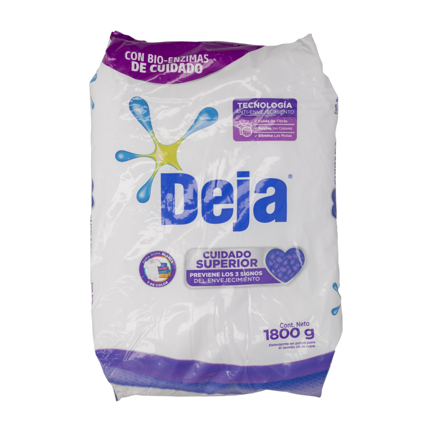 Nuevo deja cuidado superior, poderoso detergente que penetra profundamente cada fibra para eliminar las manchas más difíciles desde la primera lavada y previene los signos de envejecimiento de tu ropa. Gracias a su tecnología antienvejecimiento con bio- enzimas de cuidado protege las fibras de tu ropa, manteniéndola como nueva por mucho tiempo