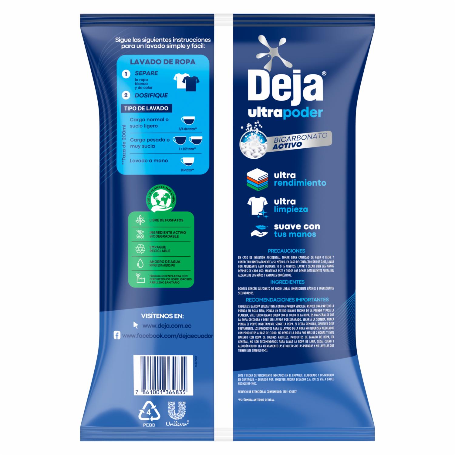 Detergente en polvo para el lavado de tu ropa, ultra poder, ultra rendimiento y ultra limpieza con bicarbonato activo. Rinde más lavadas