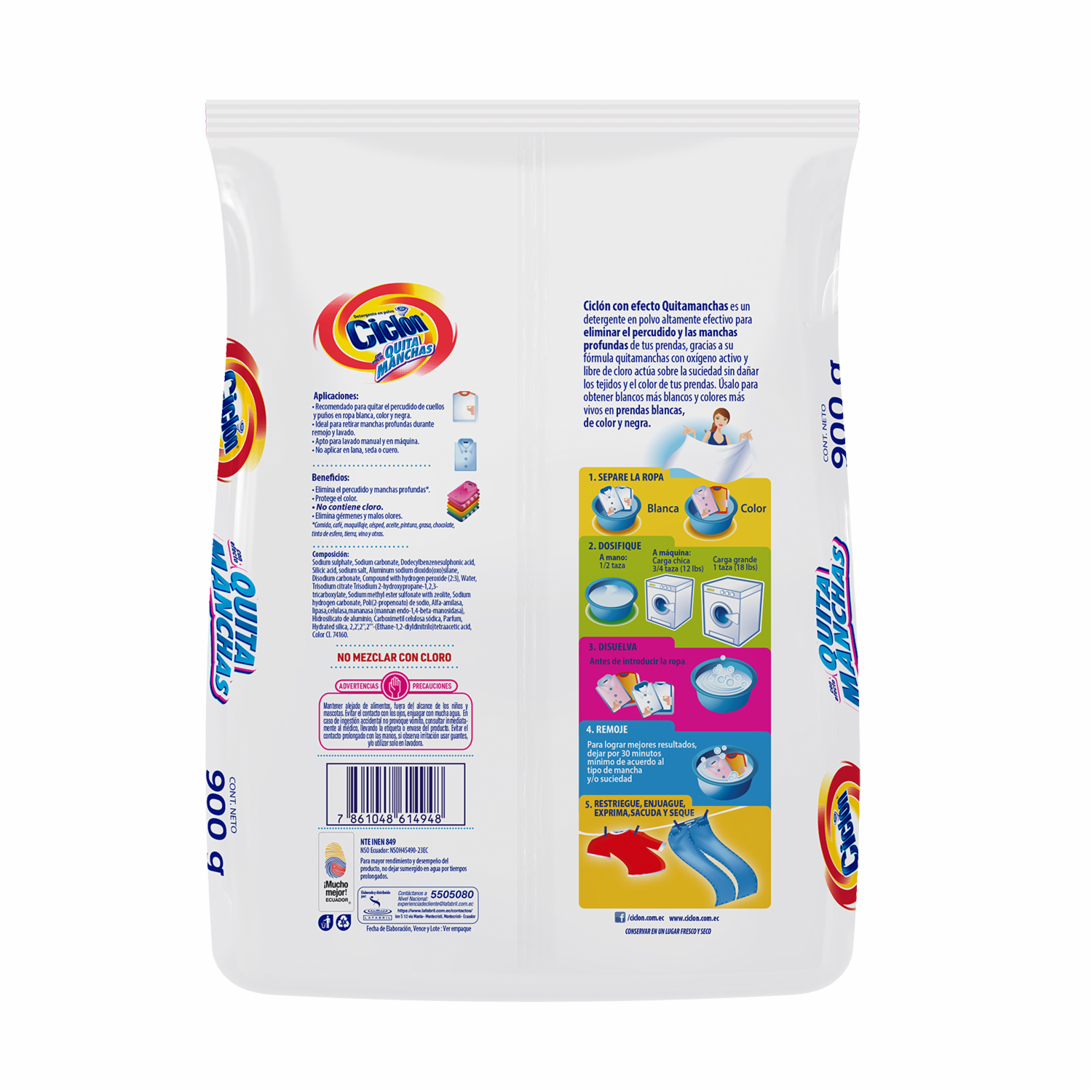 Detergente en polvo quita manchas CICLON Elimina manchas difíciles dejando la ropa limpia y fresca Ideal para lavado a mano o a máquina Características Fórmula eficaz contra manchas de grasa y suciedad Apto para ropa blanca y de color No contiene cloro Presentación en envase práctico de 900 g Facilita la limpieza profunda