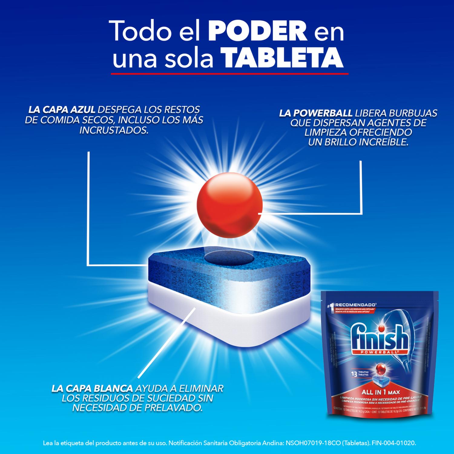 - Finish Detergente En Tabletas Para Lavavajillas Remueve Diferentes Tipos De Suciedad. Te Ayuda A Remover Hasta Los Residuos Más Difíciles Como Comida Quemada, Logrando Una Limpieza Poderosa En Cada Lavado
