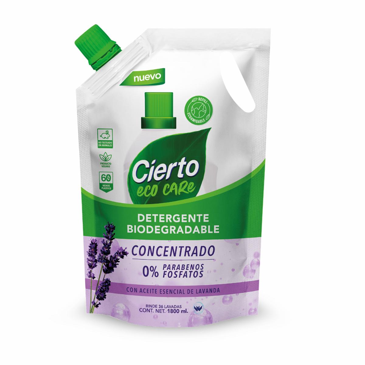 - Cierto Eco Care Concentrado: es el primer detergente ecológico biodegradable que ofrece una fórmula vegana, no testeada en animales y sin fosfatos ni parabenos.