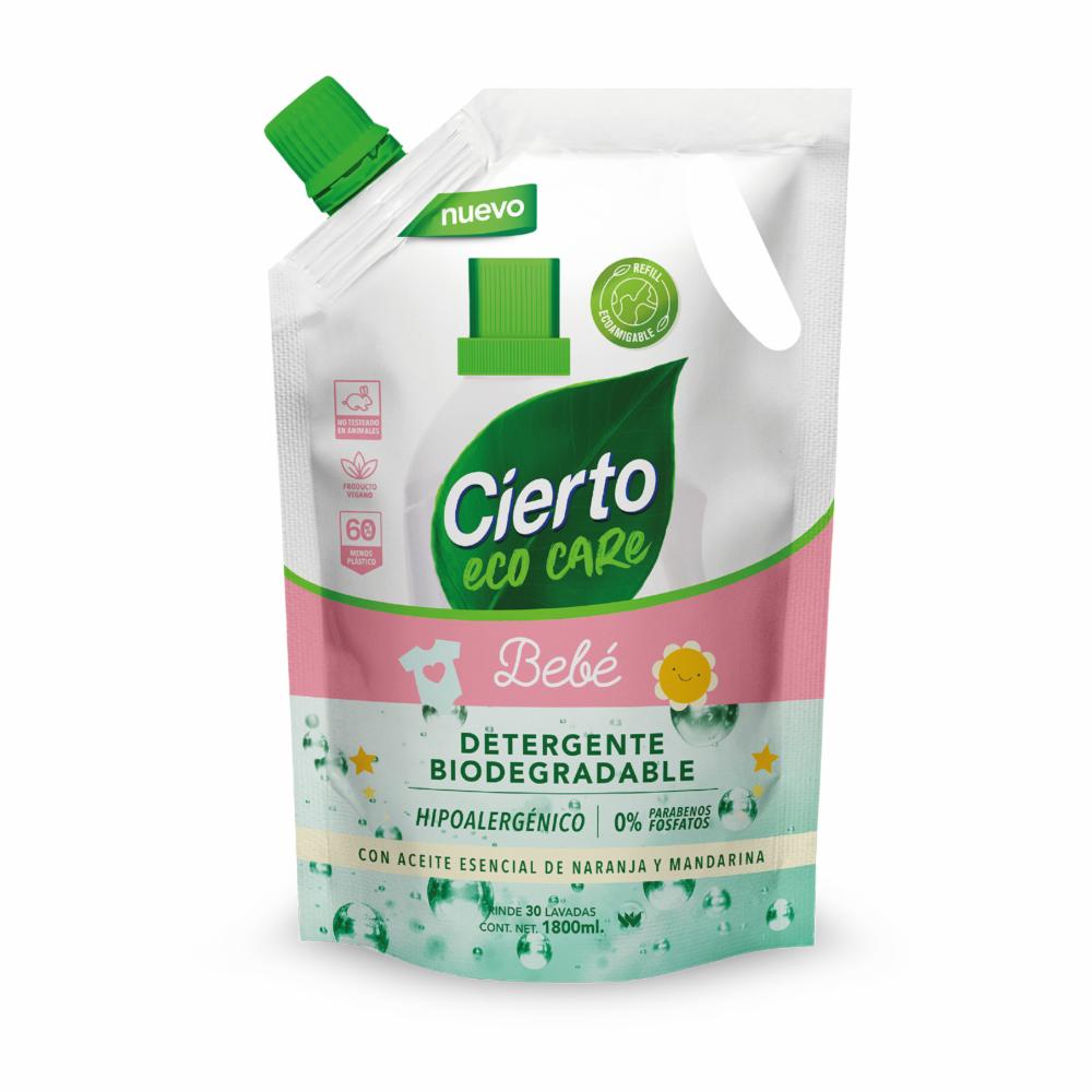 Cierto Eco Care bebé es el primer detergente ecológico biodegradable que ofrece una fórmula vegana, no testeada en animales y sin fosfatos ni parabenos. Es ideal para ropa blanca, personas con alergias, piel sensible o bebes, tiene una fórmula hipoalergénica que no irrita la piel. Y su fragancia es a base de aceites esenciales con un aroma de Naranja ? Mandarina que aporta relajación y bienestar