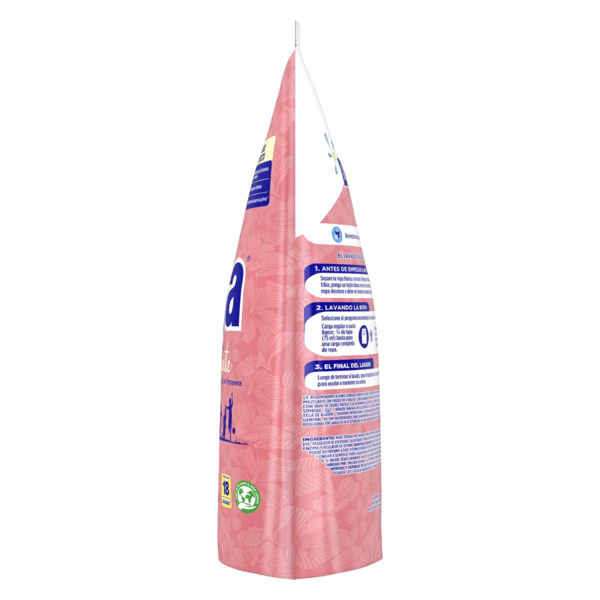 - Su poder limpiador contiene moléculas de limpieza profunda, que cuidan las fibras de tu ropa, manteniéndola como nueva y con delicioso aroma primaveral para que permanezca perfumada por más tiempo