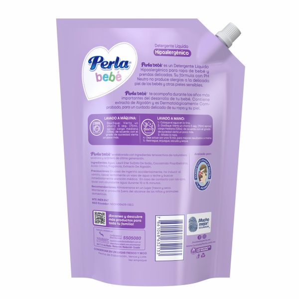 Detergente Liquido Perla Bebe Algodón Doy Pack 1300 Mililitros Es El Detergente Liquido Hipoalergénico Para Pieles Sensibles Que Deja Una Rica Fragancia Natural A Algodón