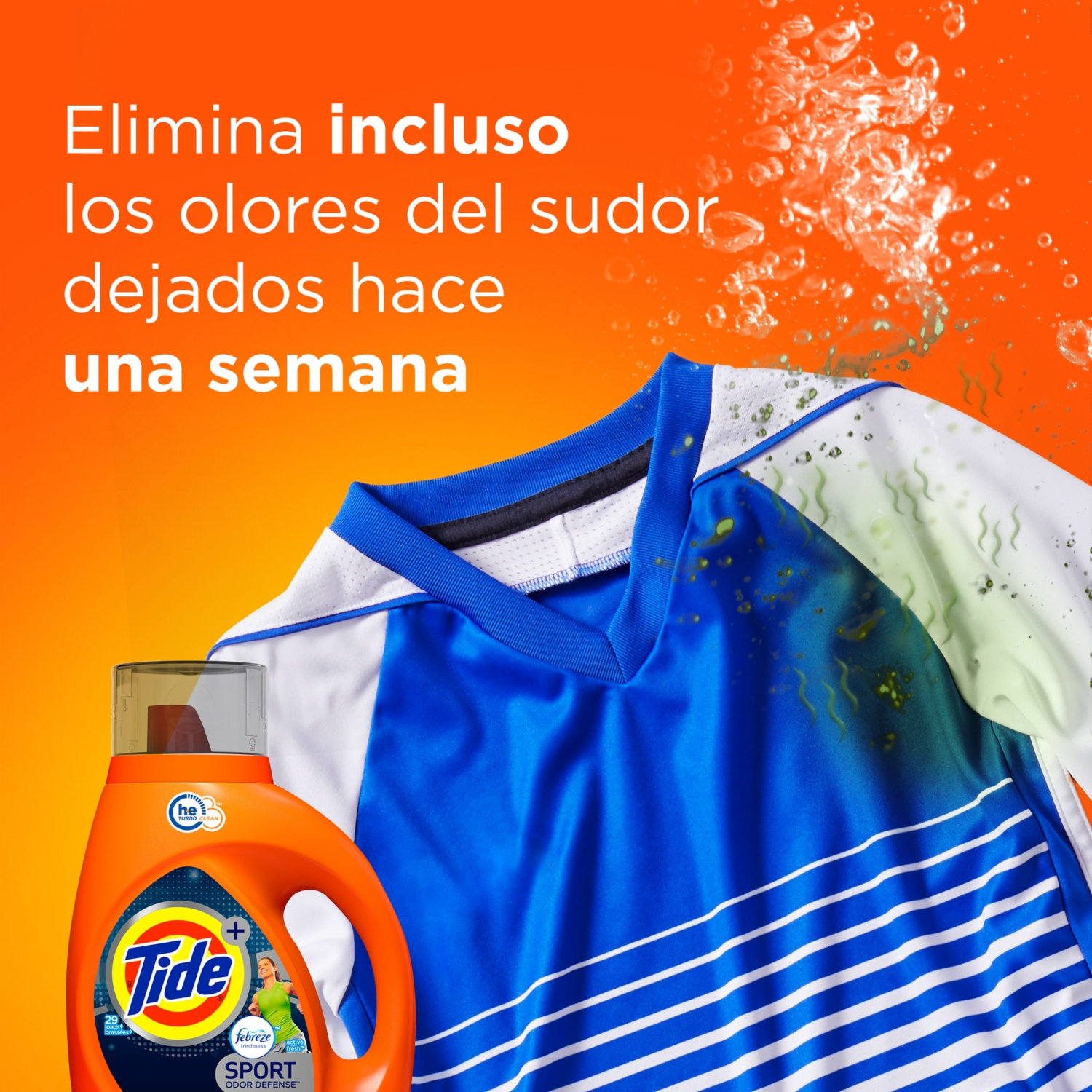 - El detergente líquido Tide Sport es ideal para tu ropa deportiva. Ese jabón para ropas ofrece la limpieza increíble de Tide mientras cuida las fibras y elimina los malos olores de la ropa de deporte. Pruébalo y disfruta de tu ropa blanca y de color limpia, sin manchas, sin mugre y sin malos olores. ¡Para la limpieza increíble que conoces y te encanta, existe solo un Tide!