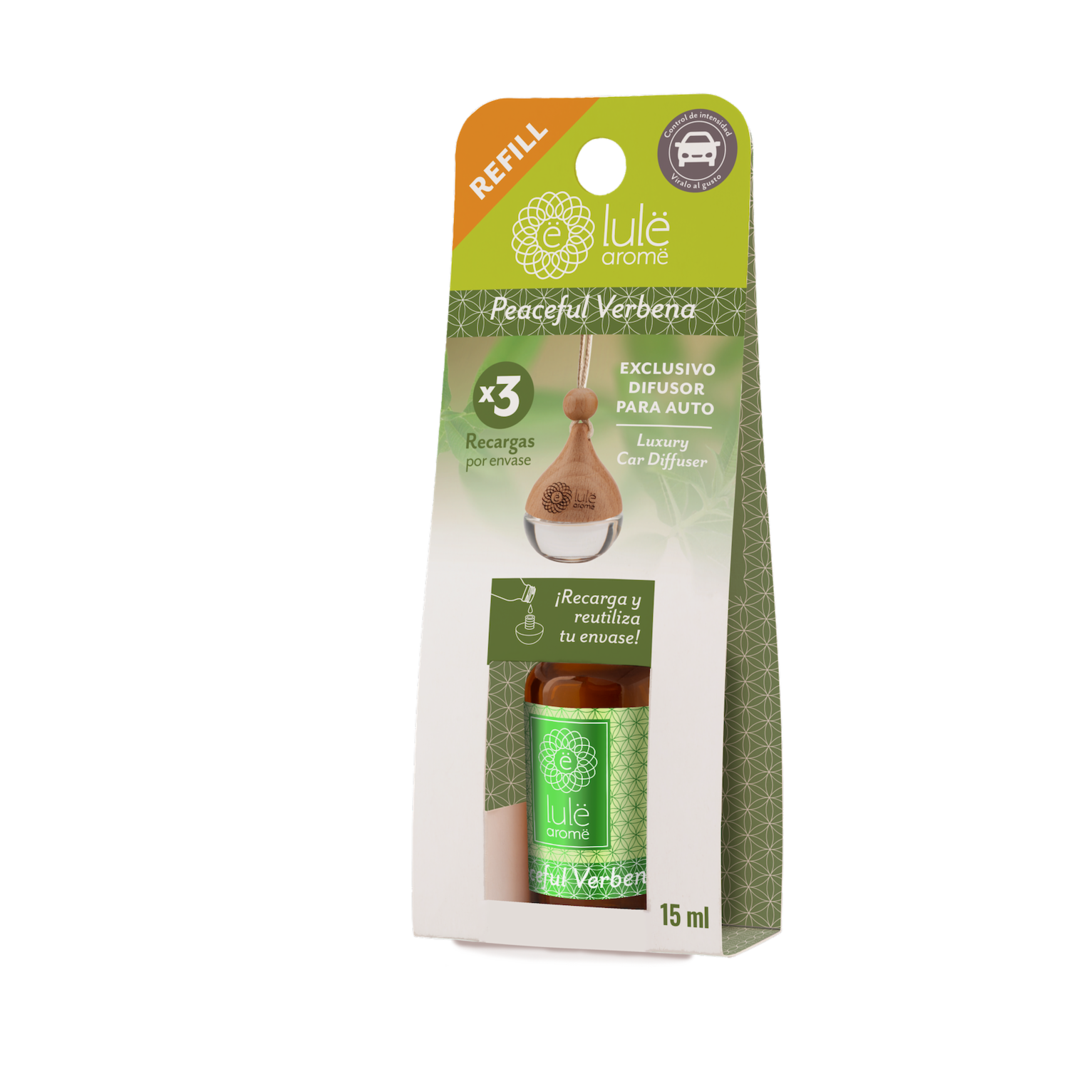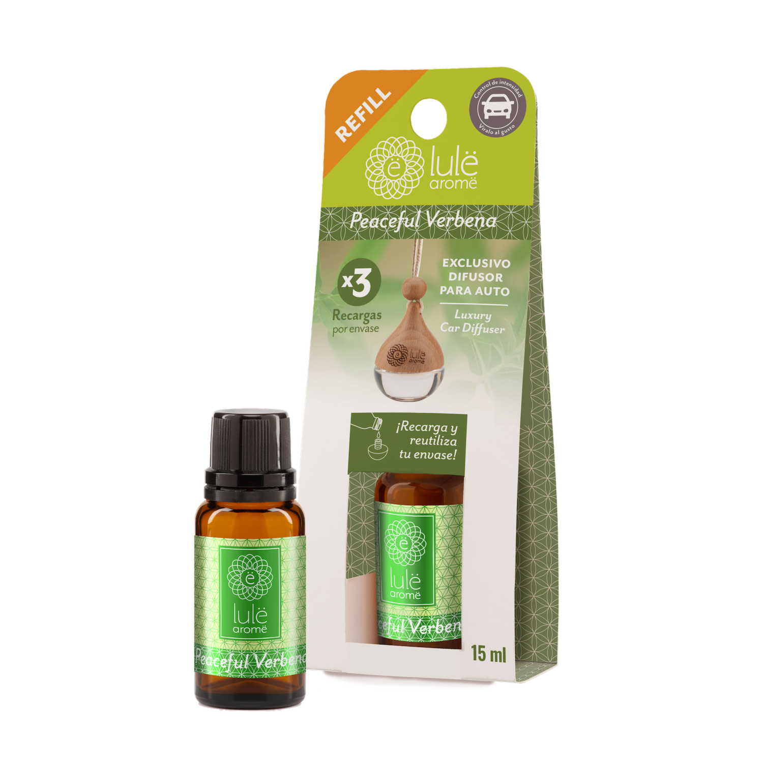 Difusor Ambiental Para Auto Recarga Fragancia Peaceful Verbena LULË AROMË 15 Ml