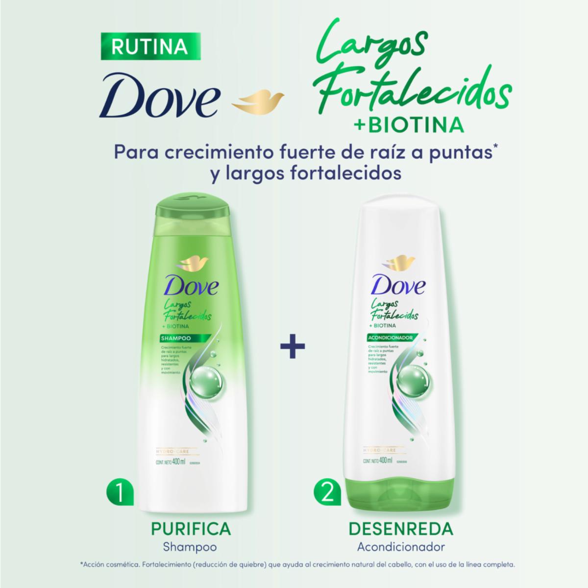 - Shampoo Dove Largos Fortalcidos + Biotina, pelo brillante, con movimiento y fuerte de raíz a puntas,? Nutre y fortalece para un cabello más resistente, flexible y visiblemente saludable de raíz a puntas.
