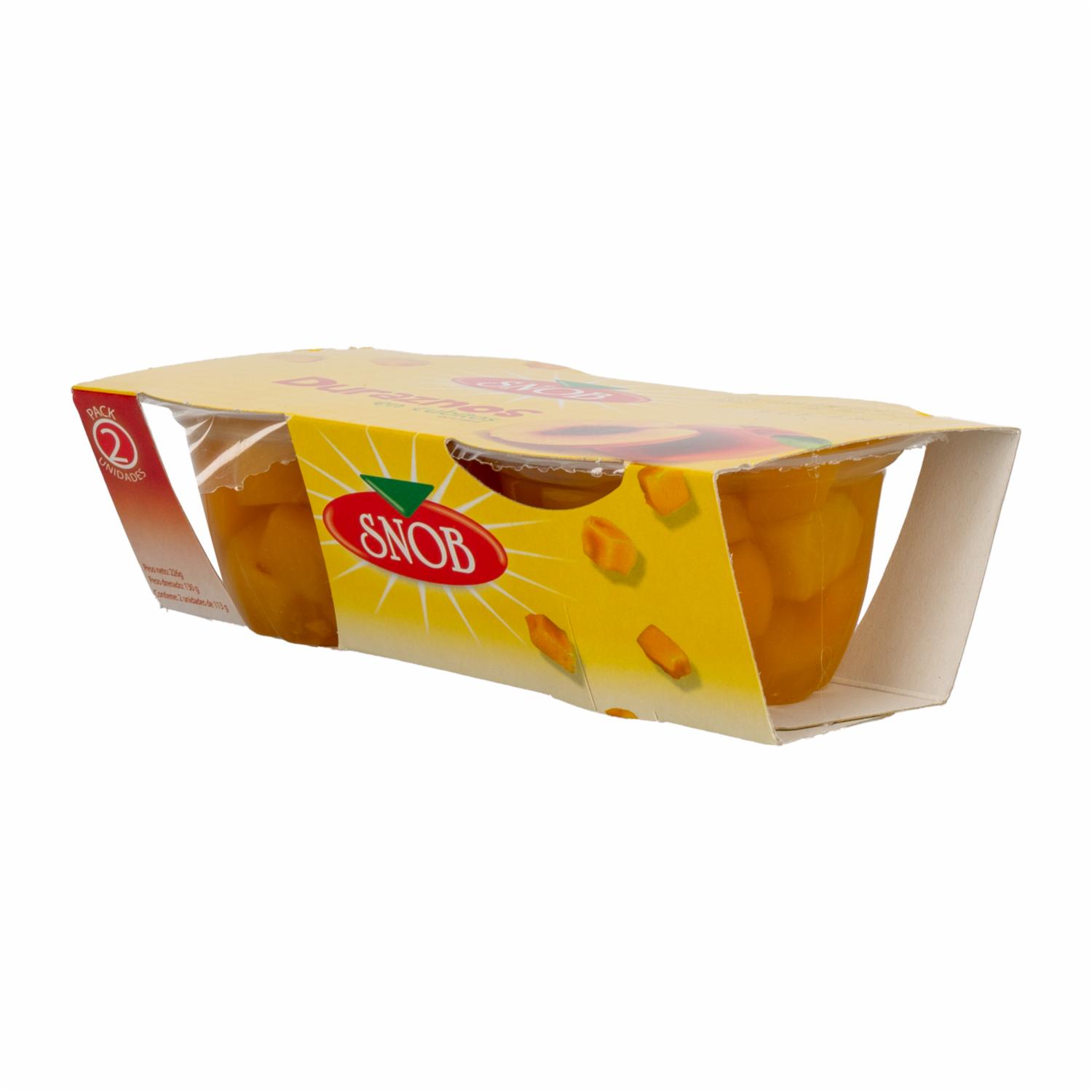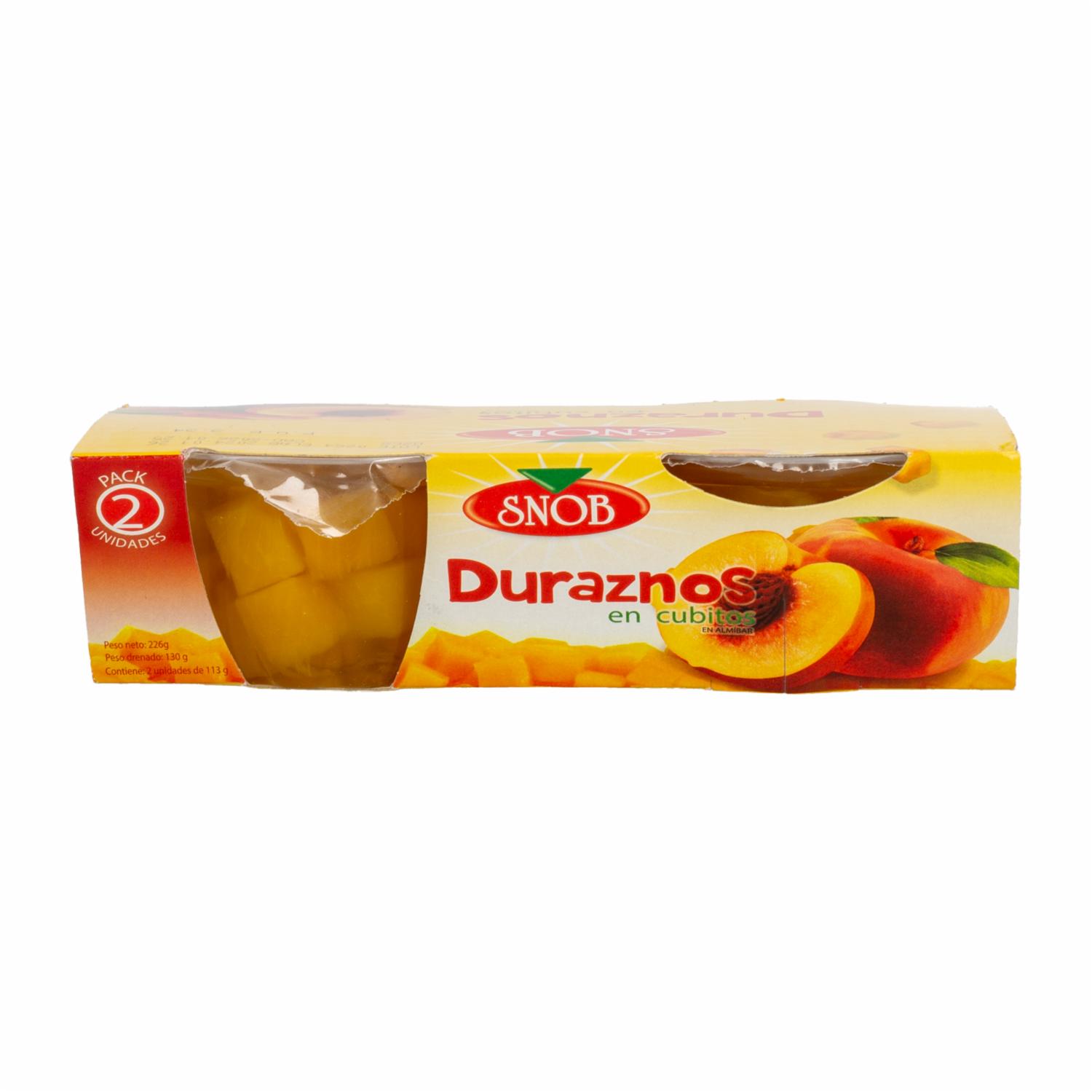 - Disfruta la dulzura y frescura de los duraznos en almíbar con SNOB. Cada pack de 2 frascos de 113 g está repleto de jugosos duraznos, cuidadosamente envasados en un suave almíbar que realza su sabor natural. Perfectos para añadir un toque dulce a tus postres, ensaladas o simplemente para disfrutar directamente del frasco