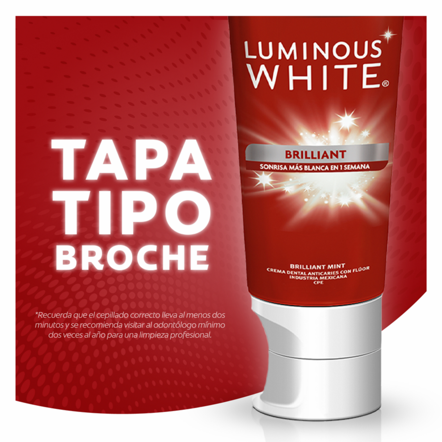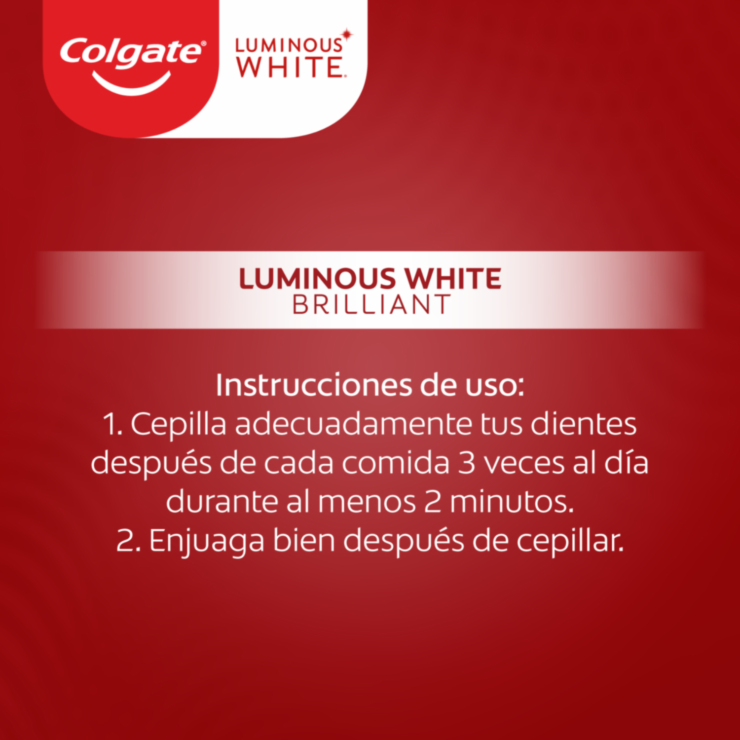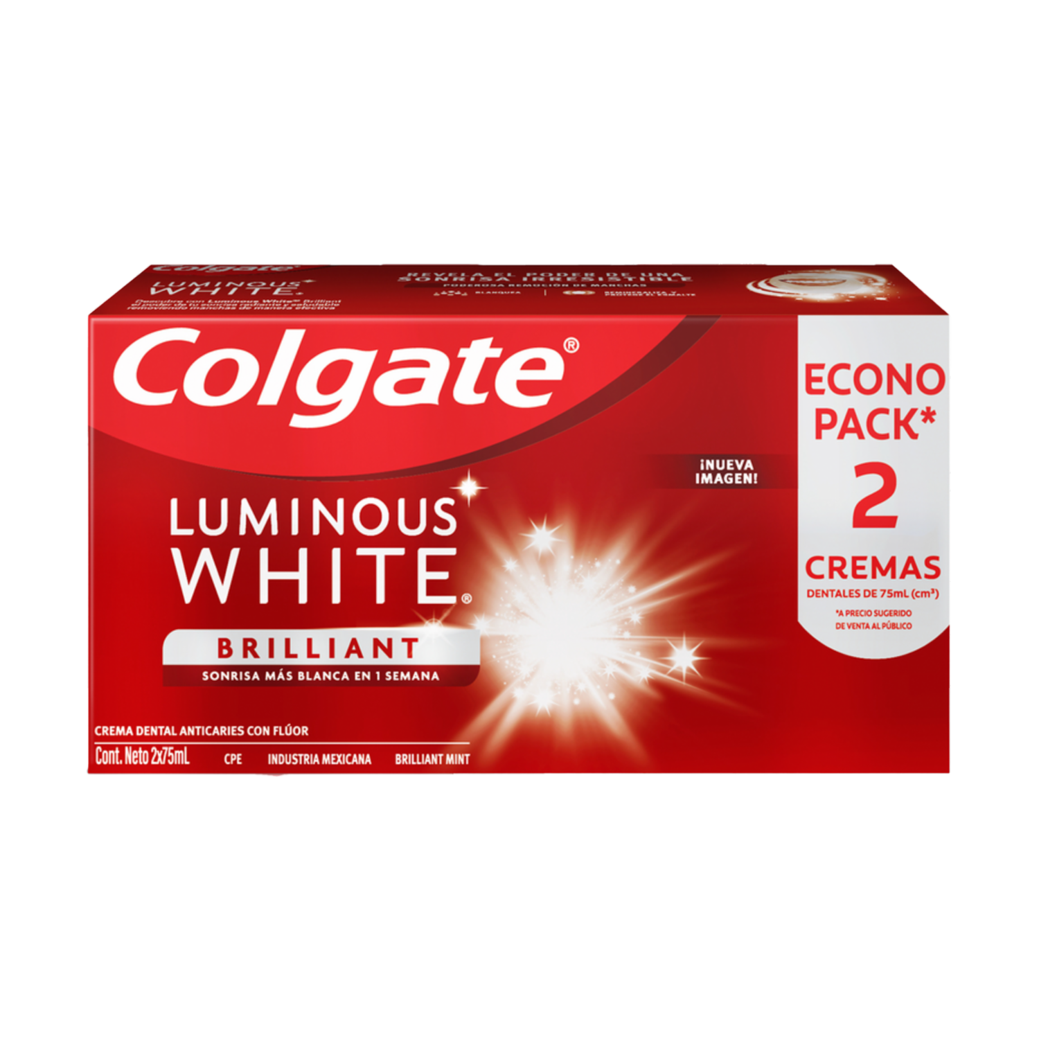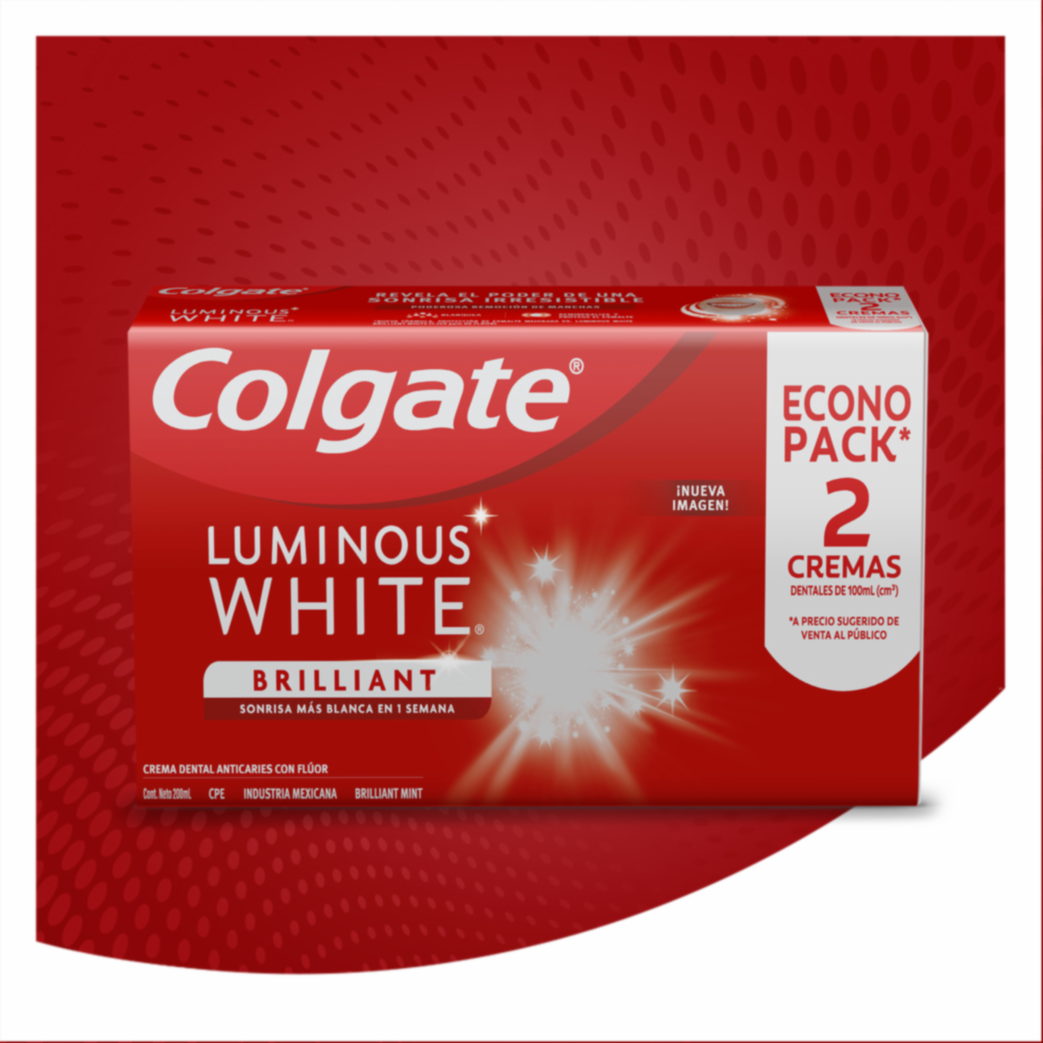 - Consigue una sonrisa más blanca en solo una semana, con la Crema Dental Colgate Luminous White Brilliant podrás lograrlo fácilmente. Obtén resultados profesionales cumpliendo con tu rutina de cuidado e higiene oral; deja que Colgate Luminous White te ayude a conseguir una sonrisa más clara, gracias a su fabulosa fórmula que además protege el esmalte de posibles daños, así mantendrás siempre piezas dentales saludables