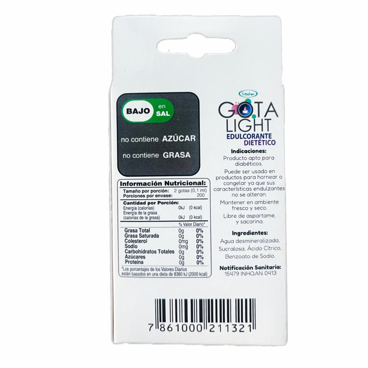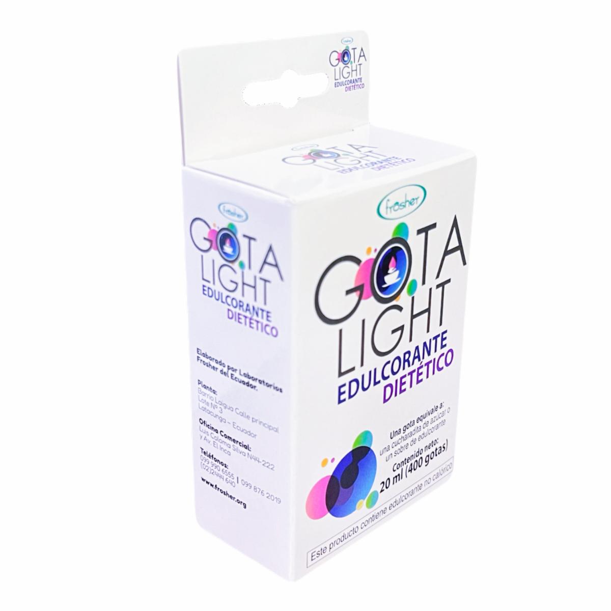 - GOTA LIGHT es un endulzante líquido cuyo compuesto principal es la sucralosa, la sucralosa es un edulcorante NO calórico derivado del azúcar, es 600 veces más dulce que la sacarosa (azúcar común). Una gota equivale a dos cucharaditas de azúcar común. GOTA LIGHT no tiene sabor residual, amargo, y/o metalizado, por lo tanto, no altera el sabor de las comidas. Es hidrosoluble por ello se disuelve rápidamente en todas las mezclas y puede ser usado en gran variedad de productos como jugos y postres.