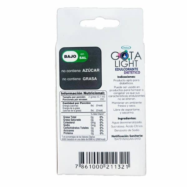 • GOTA LIGHT es un endulzante líquido cuyo compuesto principal es la sucralosa, la sucralosa es un edulcorante NO calórico derivado del azúcar, es 600 veces más dulce que la sacarosa (azúcar común). Una gota equivale a dos cucharaditas de azúcar común. GOTA LIGHT no tiene sabor residual, amargo, y/o metalizado, por lo tanto, no altera el sabor de las comidas. Es hidrosoluble por ello se disuelve rápidamente en todas las mezclas y puede ser usado en gran variedad de productos como jugos y postres.