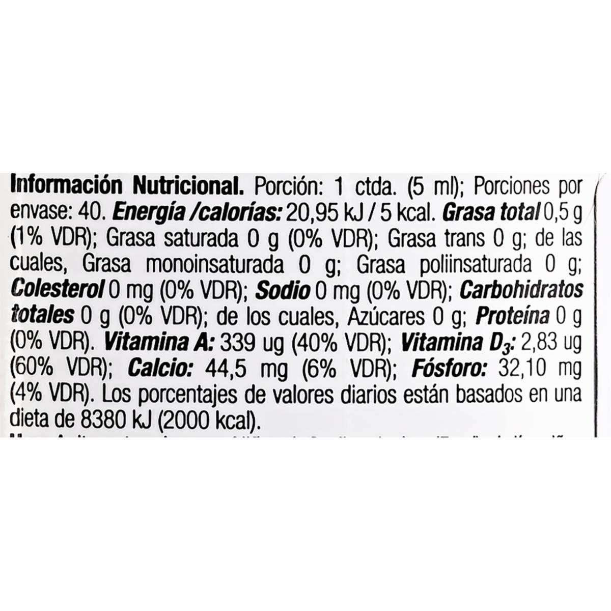 - Suplemento vitamínico rico en aceite de hígado de bacalao, vitaminas A y D, calcio y fósforo