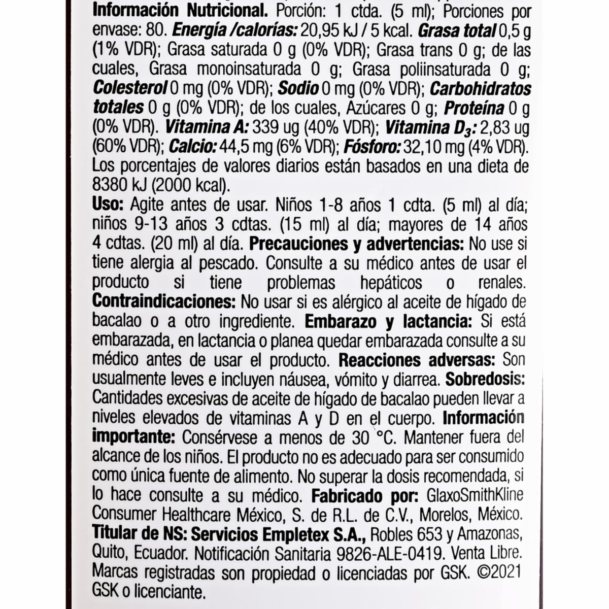 - Es un complemento vitamínico rico en aceite de hígado de bacalao. Es fuente natural de vitaminas A y D, además contiene calcio y fósforo adicionados