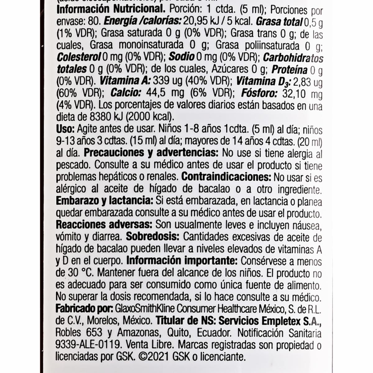 - Complemento vitamínico rico en aceite de hígado de bacalao fuente natural de vitaminas A y D, además contiene calcio y fósforo adicionados