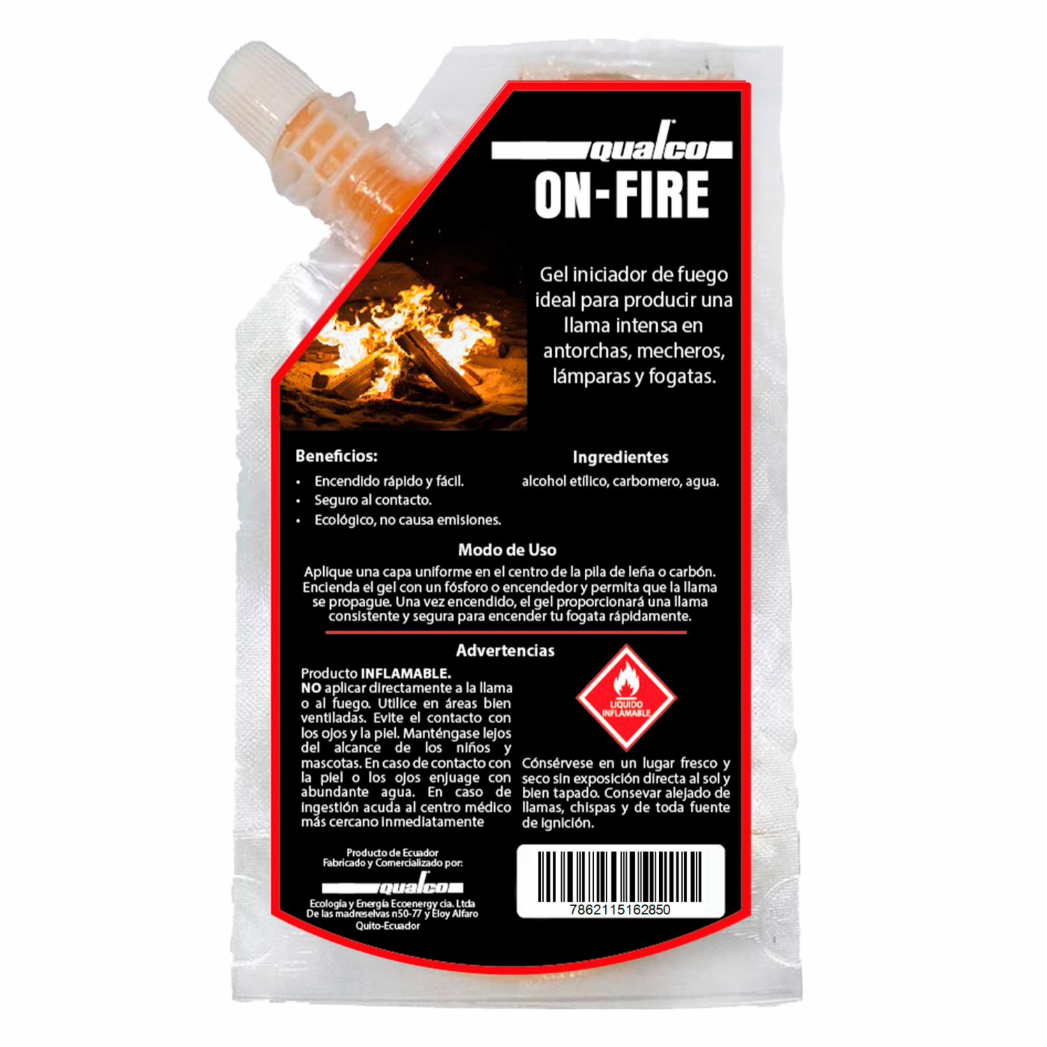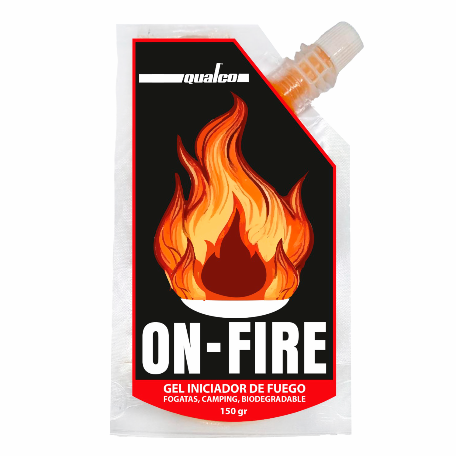 - QUALCO ON FIRE: Gel iniciador de fuego 100% seguro de transportar y biodegradable. Encendido inmediato, buena duración de la llama. Libre de compuestos hidrocarburos aromáticos. Brinda facilidad para encender cualquier tipo de fuego en fogatas, parrillas de carbón o como fuentes de calor