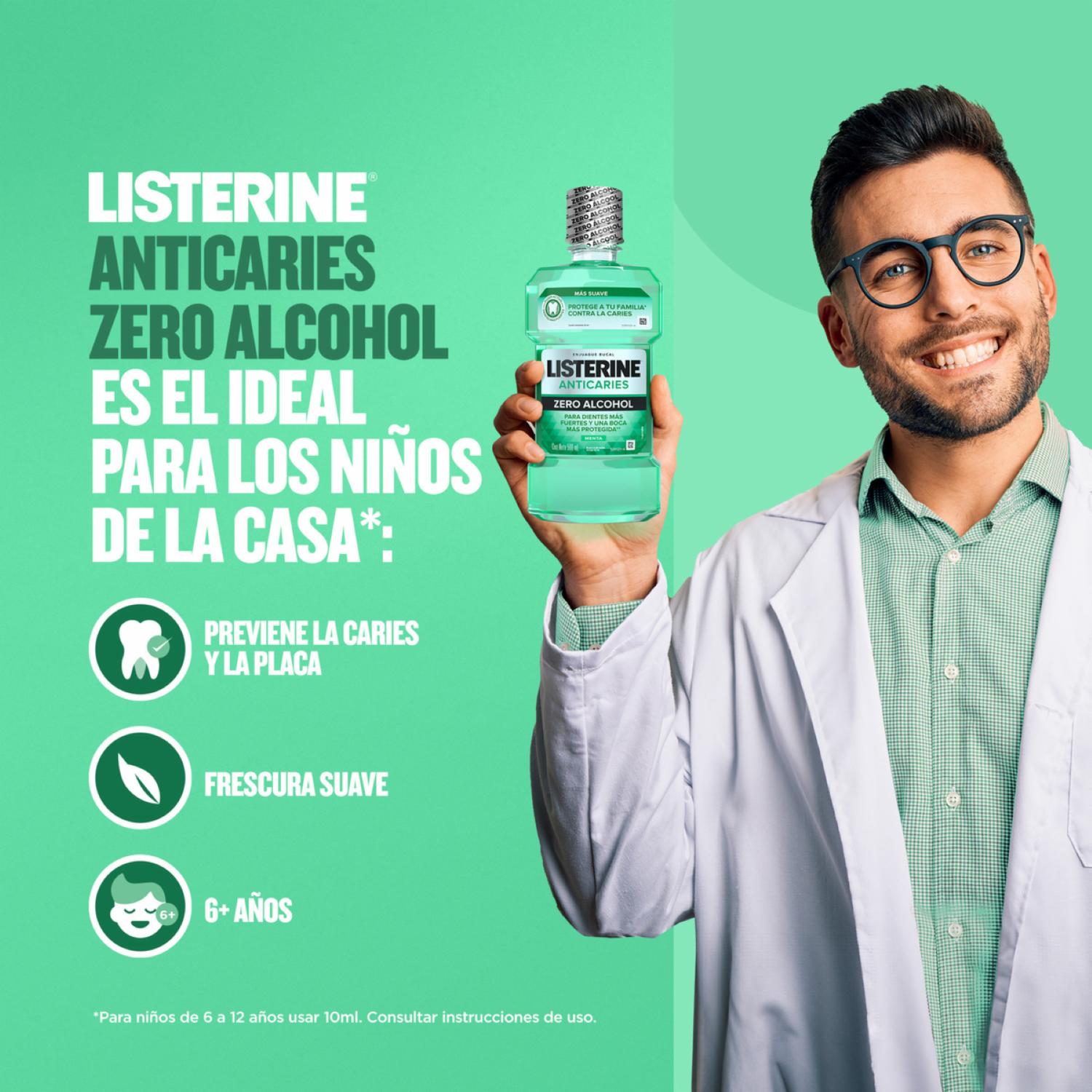 - LISTERINE® Anticaries Zero? Alcohol es un enjuague bucal de uso diario, con eficacia clínicamente comprobada, que gracias a que tiene 0% alcohol es ideal para toda la familia.*(*Niños mayores de 6 años)