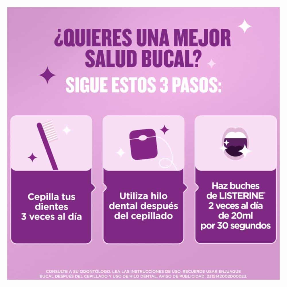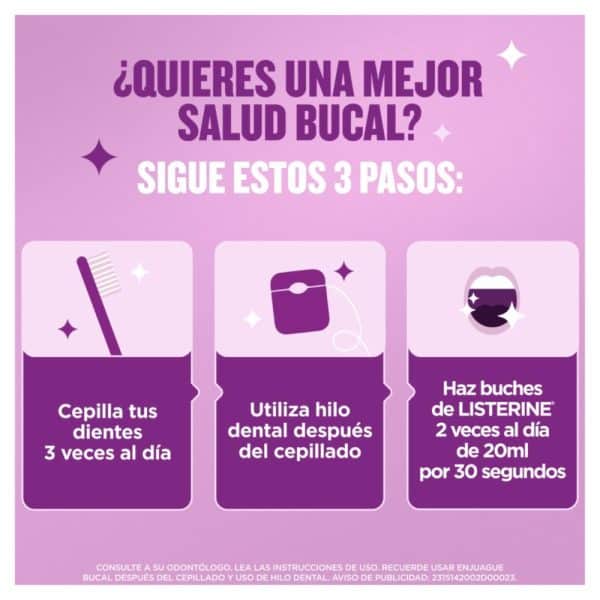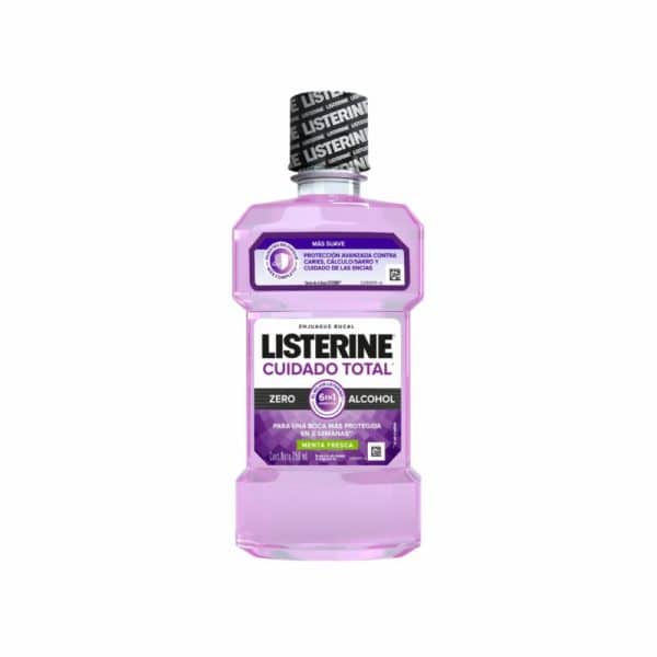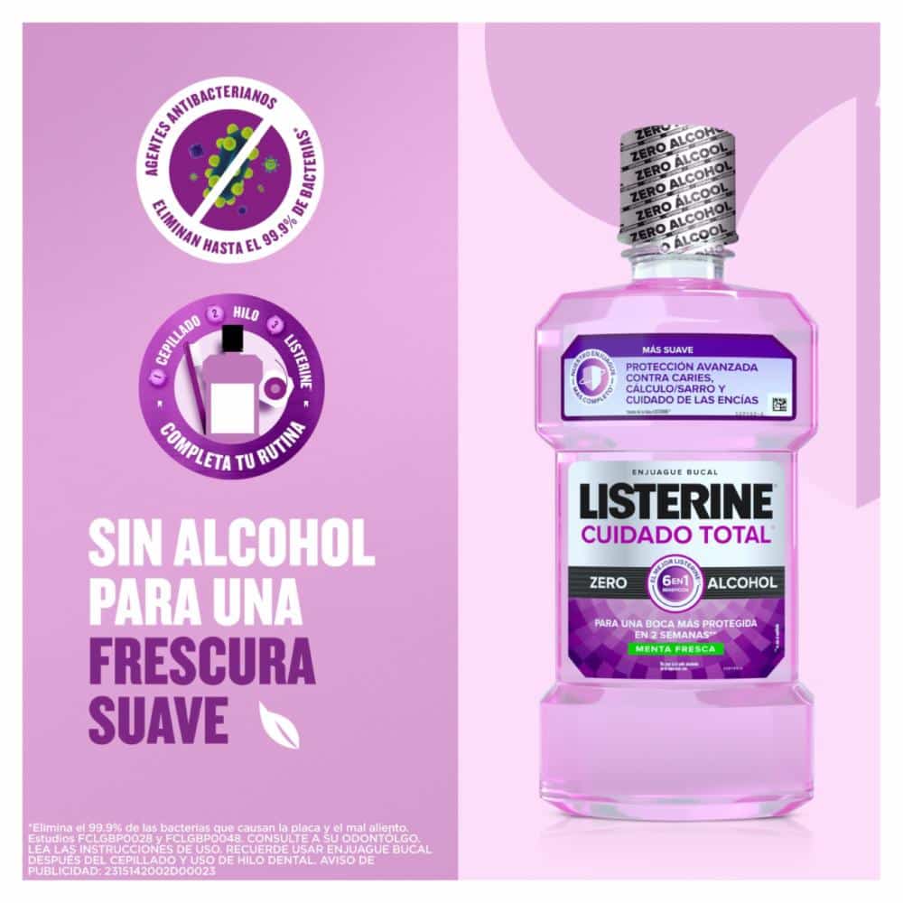 LISTERINE® Cuidado Total, el LISTERINE más completo con 6 beneficios en 1: previene caries, fortlece el esmalte, previene la placa bacteriana, ayuda a reducir la formación de sarro, encías protegidas y aliento fresco. Elimina hasta el 99% de los gérmenes* que causan la placa, caries y mal aliento. Enjuague bucal sin alcohol para quienes buscan un sabor más suave