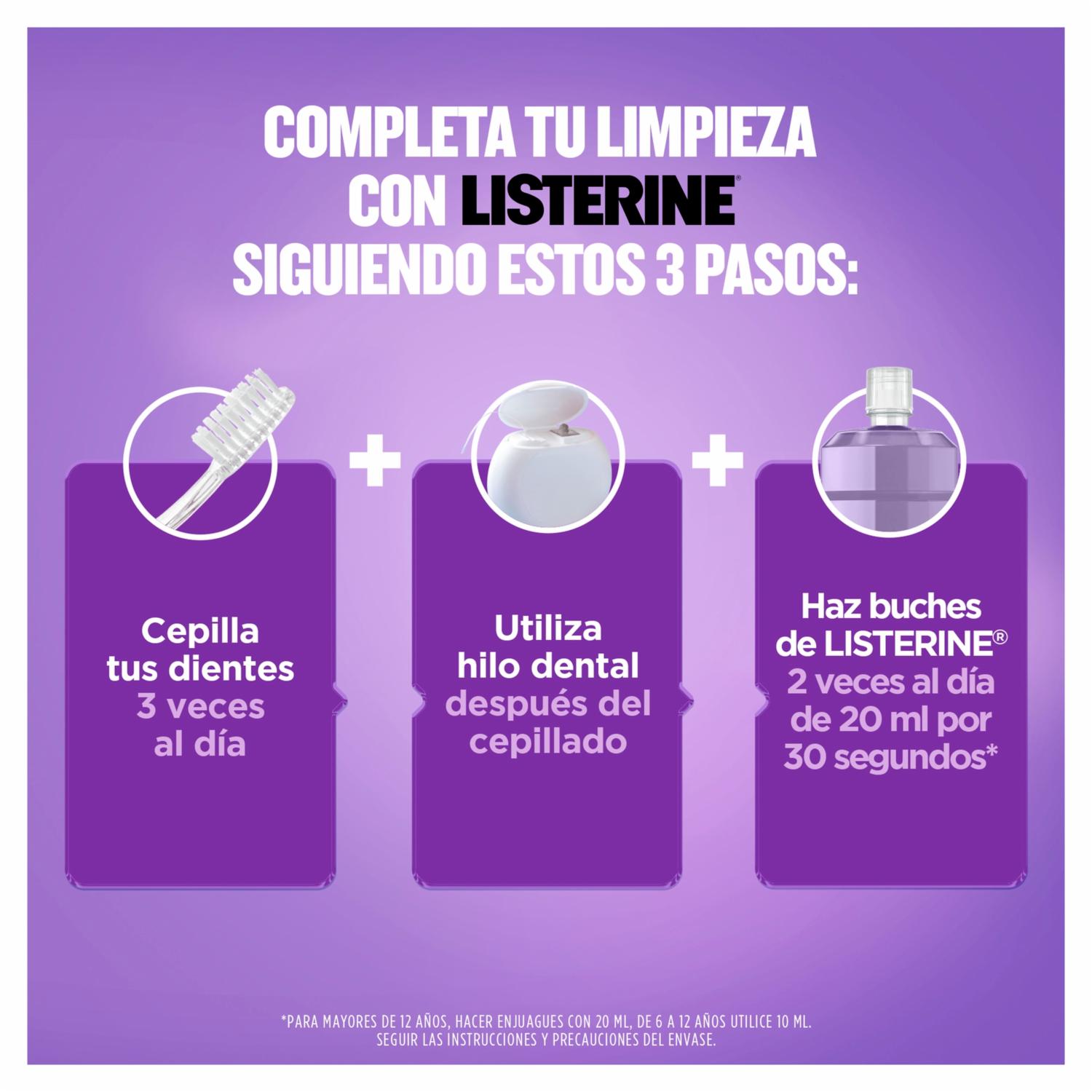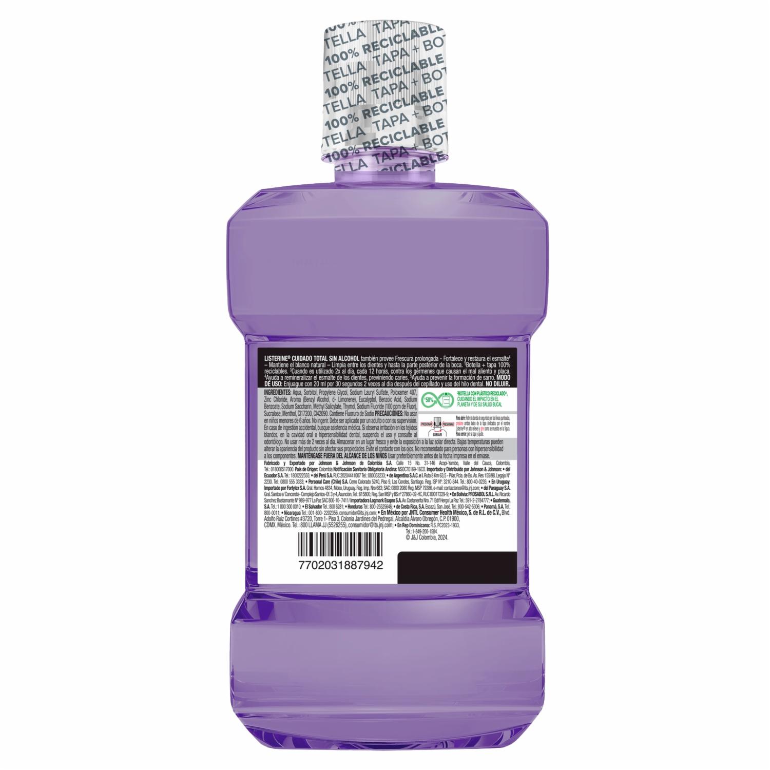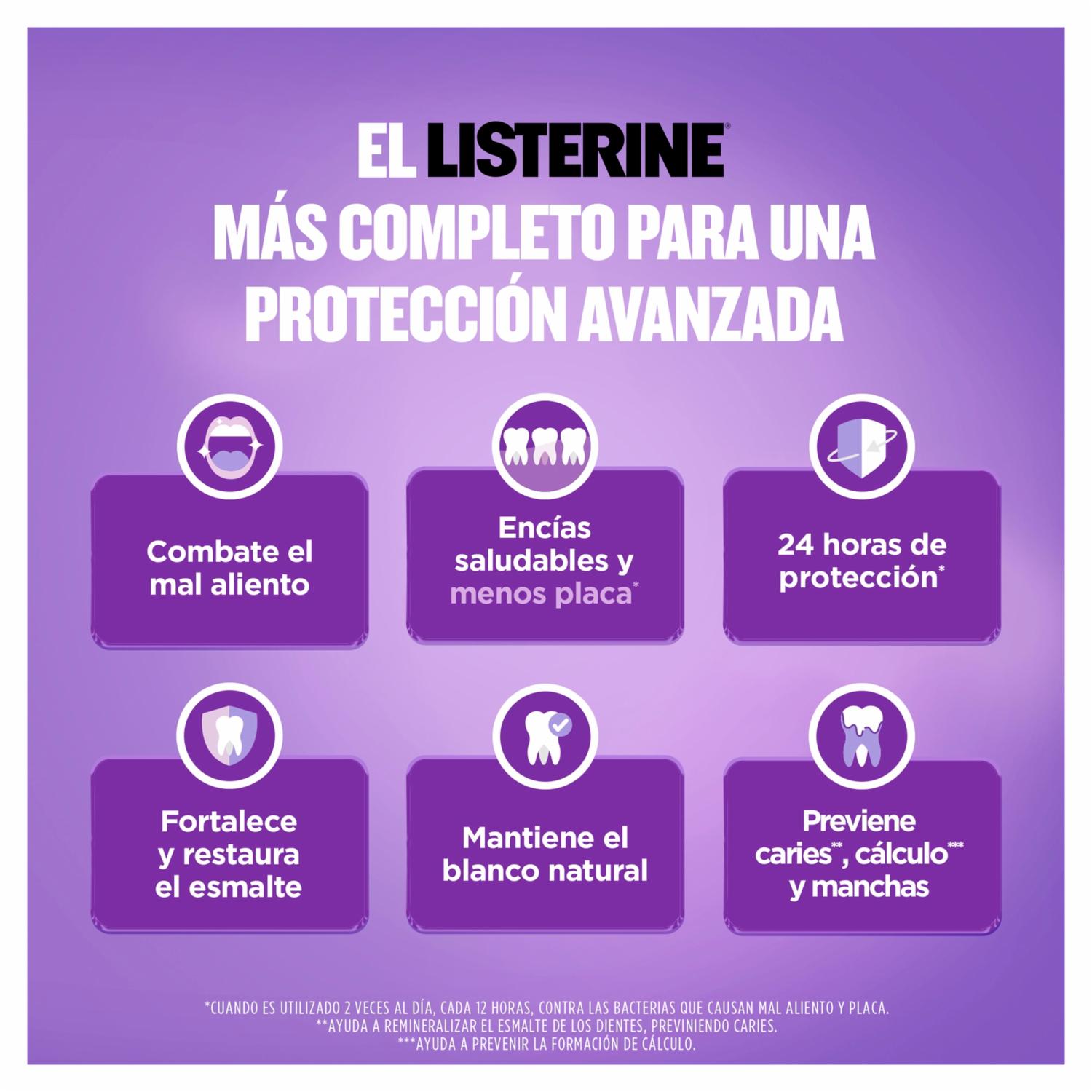 - LISTERINE® Cuidado Total, el LISTERINE más completo con 6 beneficios en 1: previene caries, fortlece el esmalte, previene la placa bacteriana, ayuda a reducir la formación de sarro, encías protegidas y aliento fresco. Elimina hasta el 99% de los gérmenes* que causan la placa, caries y mal aliento. Enjuague bucal sin alcohol para quienes buscan un sabor más suave.*Elimina el 99% de las bacterias que causan la placa y el mal aliento. Estudios FCLGBP0028 y FCLGBP0048