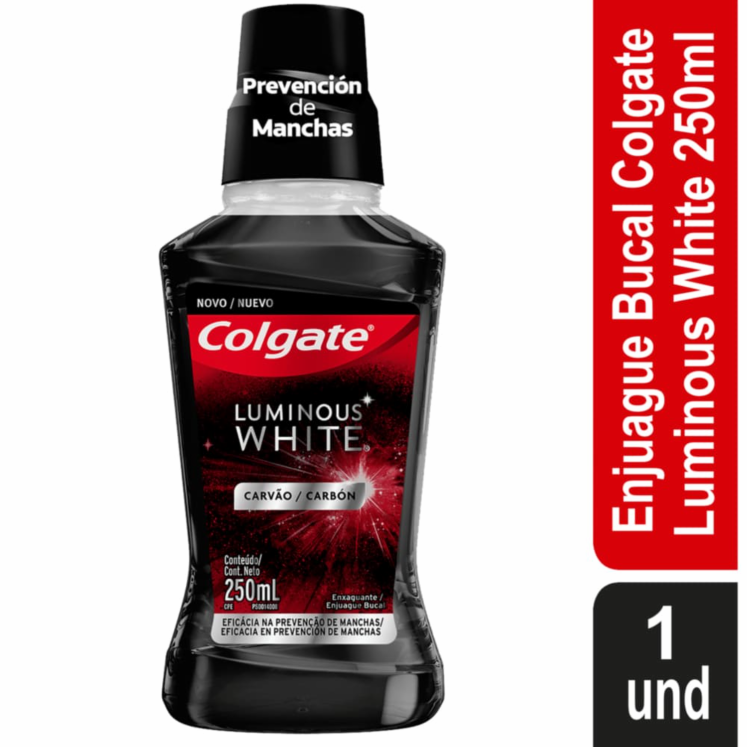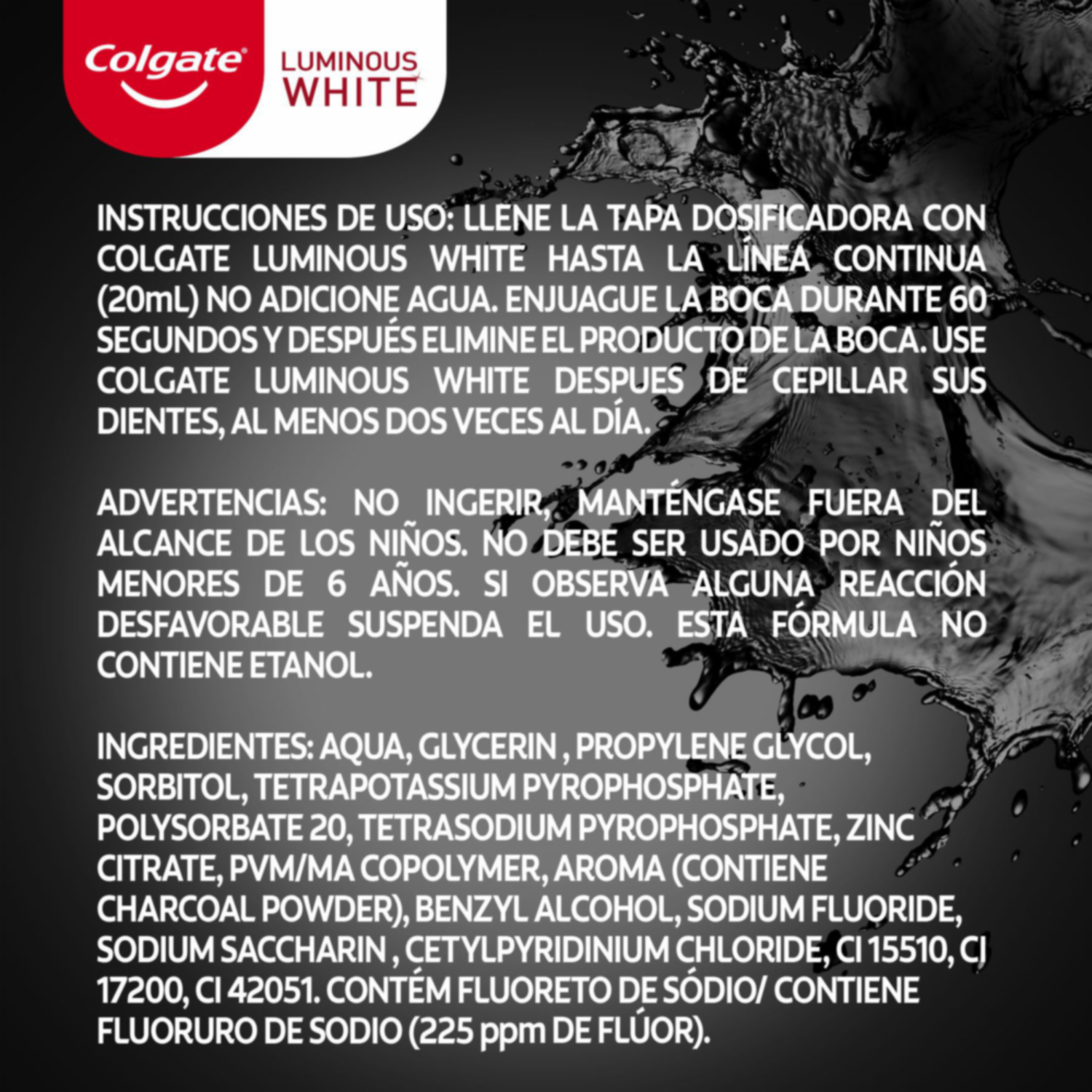 - El enjuague bucal Colgate Luminous White Carbón 250ml es ideal para una sonrisa deslumbrante. Su tecnología poderosa ayuda a fortalecer y prevenir las manchas en los dientes para mantener una sonrisa blanca y sana
