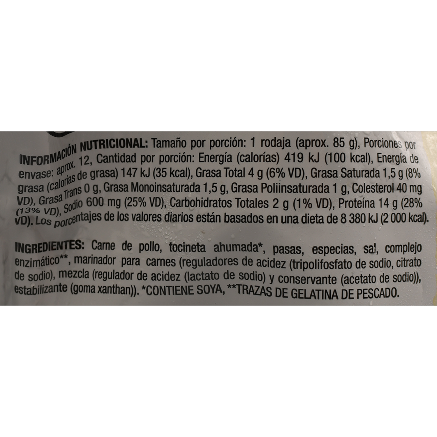 Enrollado de pechuga de pollo, completamente adobado, con una mezcla de tocino y pasas, ideal para almuerzos, cenas o reuniones pequeñas