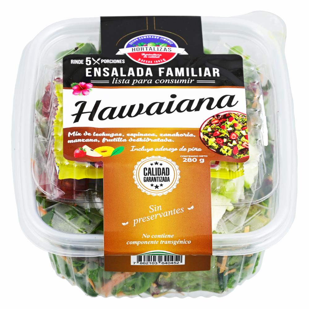 Ensalada familiar Hawaiana lista para consumir. Una deliciosa mezcla de lechugas, espinaca, zanahoria, manzana y frutilla deshidratada. Fresca, colorida y perfecta para compartir en cualquier ocasión