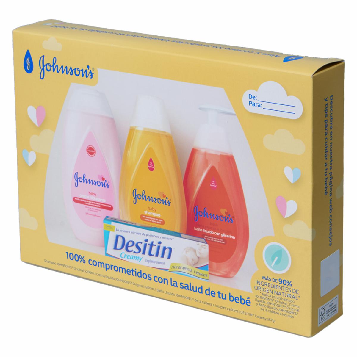 - Incluye - 1 shampoo Johnson´s de 200 Ml - 1 crema hidratante Johnson´s de 200 Ml - 1 baño líquido Johnson´s de 200 Ml - 1 crema antipañalitis Desitín de 57 G