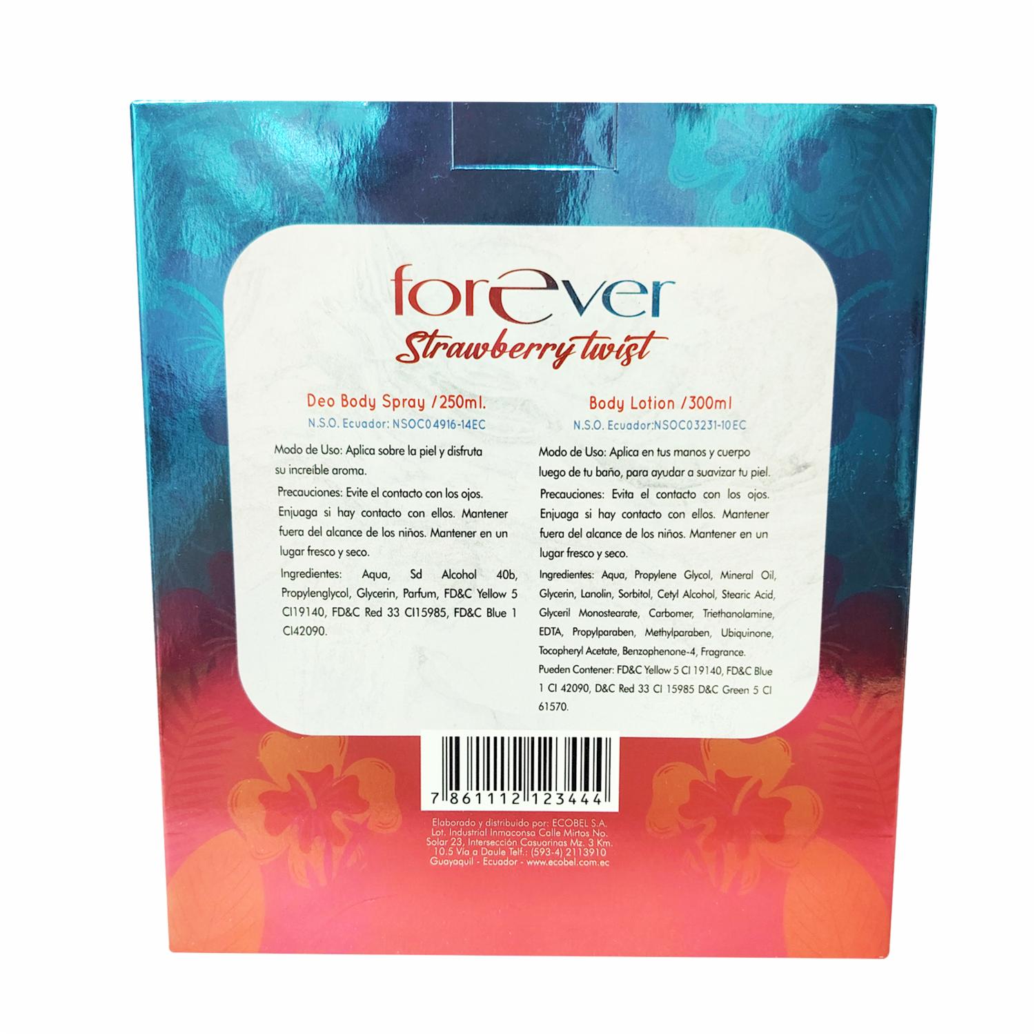 • Estuche Metalizado Forever Paradise Strawberry Twist incluye productos con una fragancia fresca y frutal, con notas jugosas de fresa