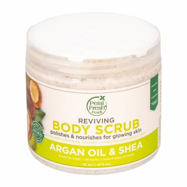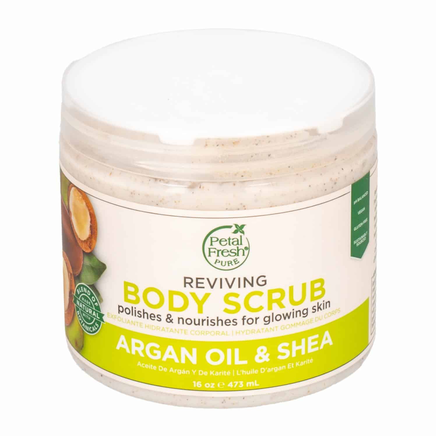 El "Exfoliante Body Scrub Argán Oil & Shea Petal Fresh Pure 473 Ml" es otro producto de cuidado personal diseñado para exfoliar y suavizar la piel del cuerpo, enriquecido con aceite de argán y manteca de karité