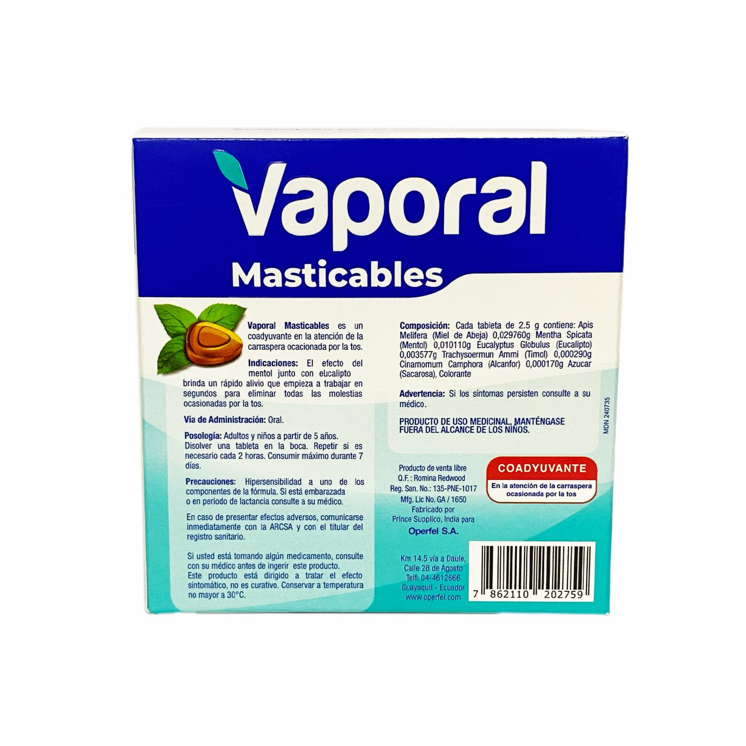 - El producto VAPORAL es un expectorante en tabletas masticables que ayuda a aliviar la congestión nasal y la tos productiva. Sus principales propiedades son:. - Ayuda a disminuir la viscosidad del moco en las vías respiratorias, facilitando su eliminación,- Alivia la irritación de la garganta y reduce la inflamación de las vías respiratorias